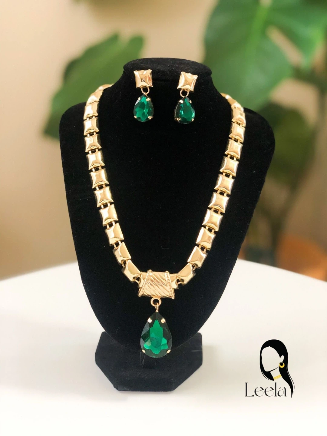 Gold & Emerald Green Necklace & Earrings Set
