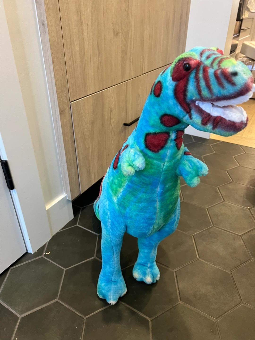 Here's a super cute T-Rex plush from Melissa & Doug! It's in great condition and would make a wonderful addition to any kiddo's collection or a fun decorative piece.