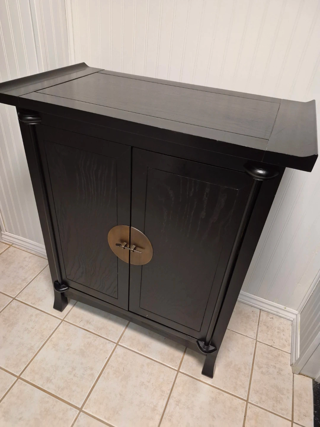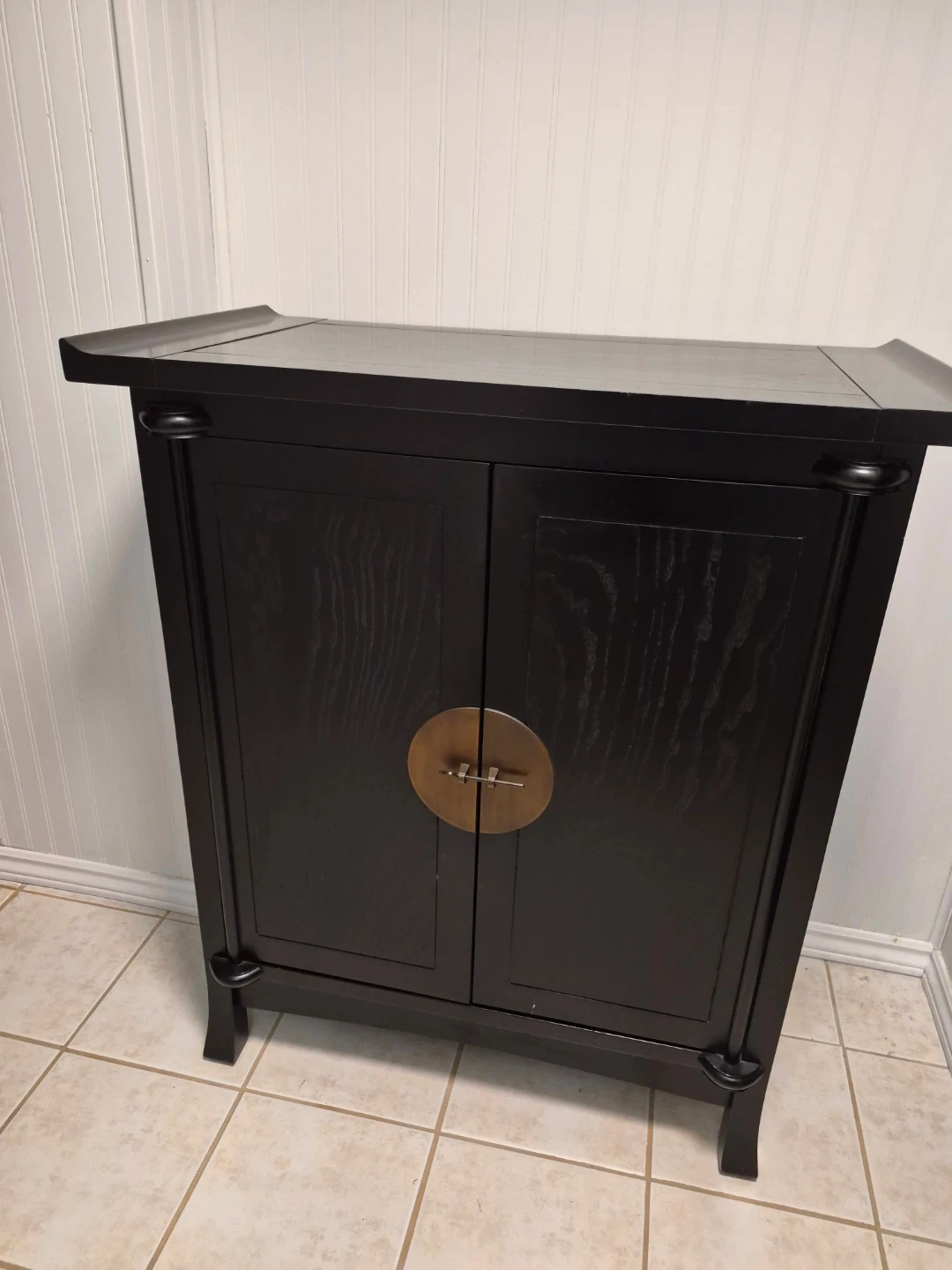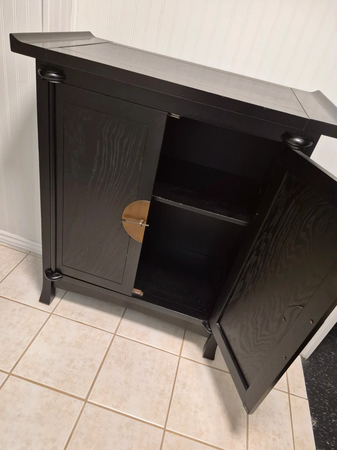 Selling a beautiful black accent cabinet! It's in great condition and would look lovely in any room. It features a unique design with a brass-coloured circular door handle. Perfect for adding a touch of elegance to your home decor