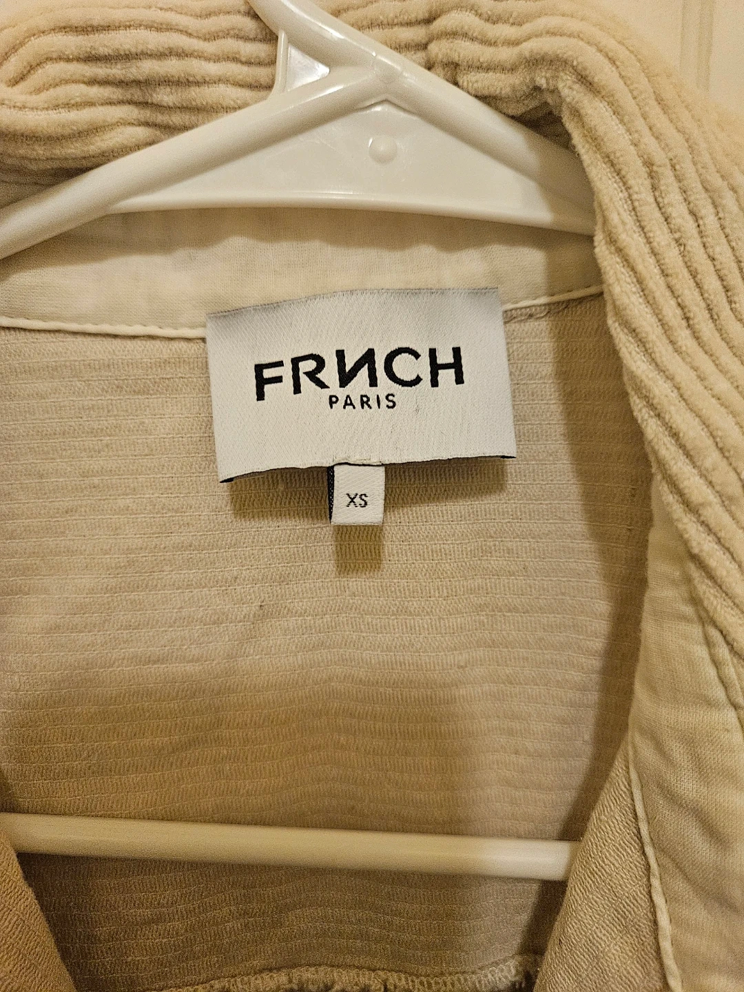 This is a FRNCH Paris corduroy jumpsuit in size XS. It's made of 100% cotton and has a button-up front with a tie waist. It's in good condition. It is 55 inches long.