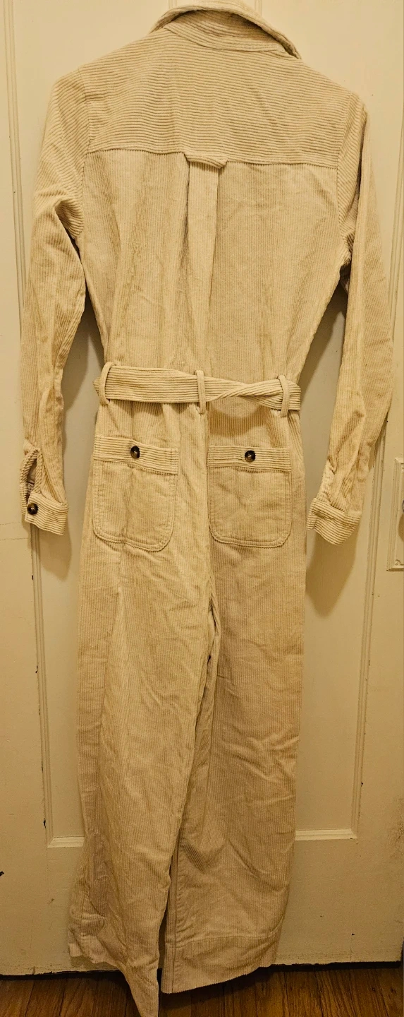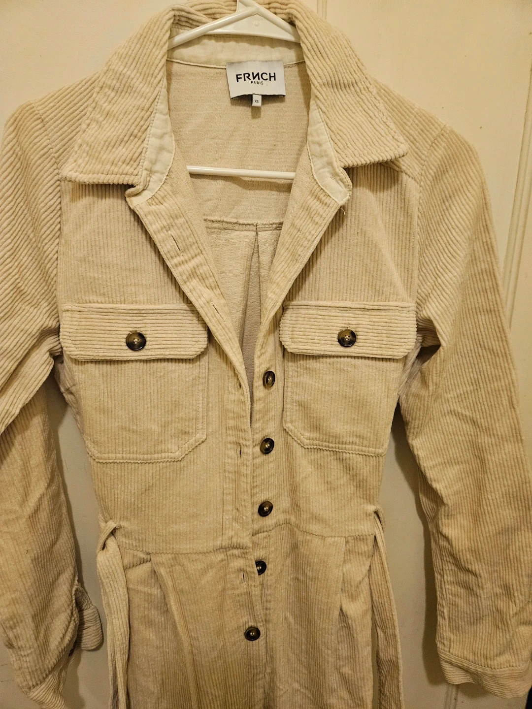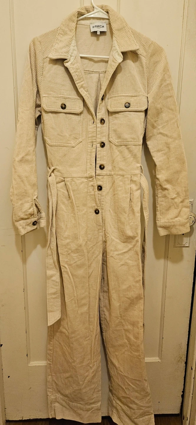 This is a FRNCH Paris corduroy jumpsuit in size XS. It's made of 100% cotton and has a button-up front with a tie waist. It's in good condition. It is 55 inches long.