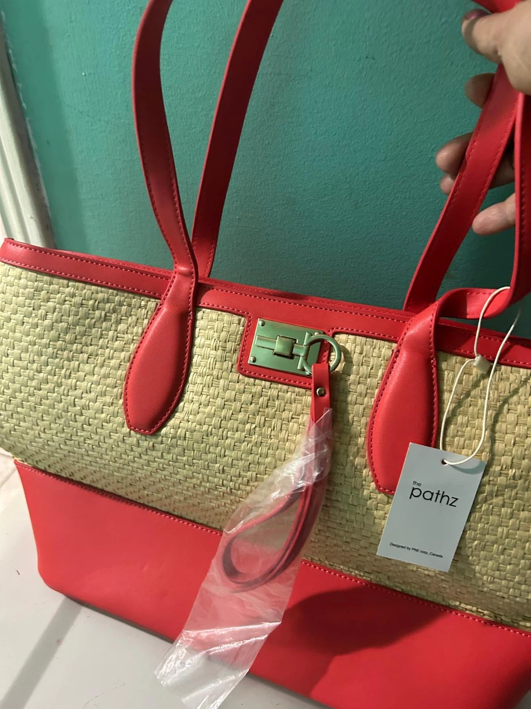 Check out this brand new with tags The Pathz tote bag! It's a vibrant red colour and has a unique design with woven material on the upper half. Perfect for carrying your essentials in style