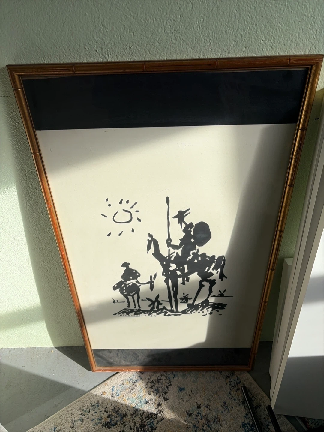 Selling a framed art print featuring Picasso's '55 Don Quixote design. The frame has a bamboo-style finish. It's a striking piece that would add a touch of artistic flair to any room