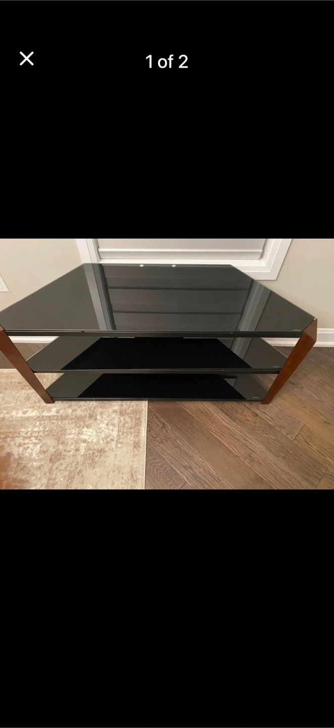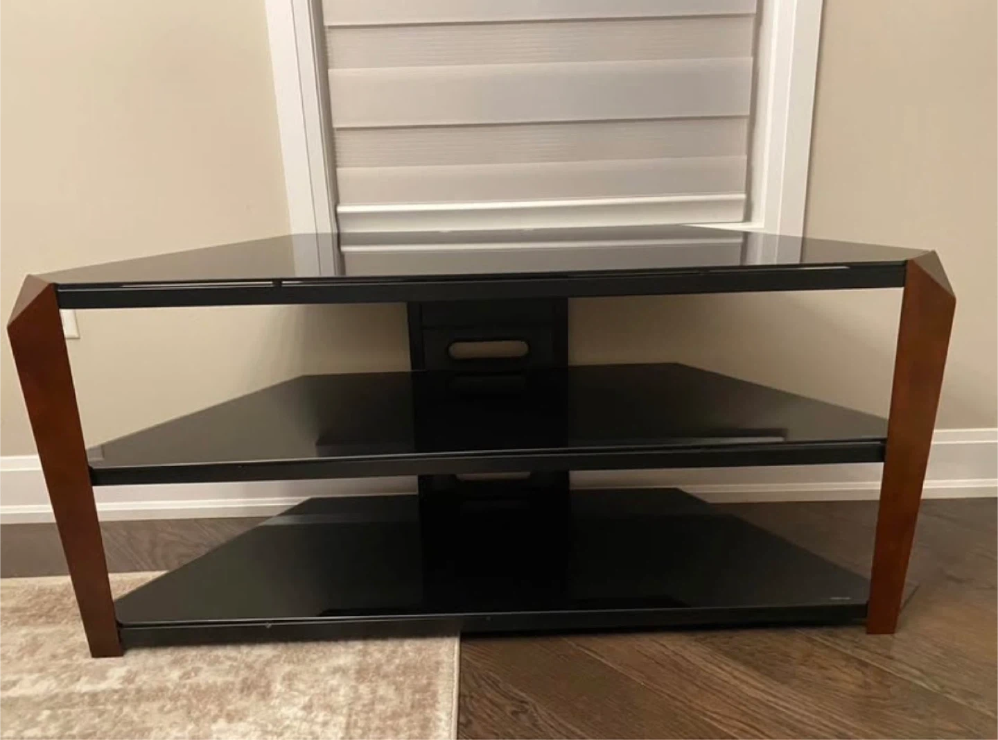 Modern TV stand in like-new condition — no scratches or damage. Features 3 black tempered glass shelves with solid wood side legs. Sleek, sturdy, and perfect for TVs, gaming consoles, or media equipment.