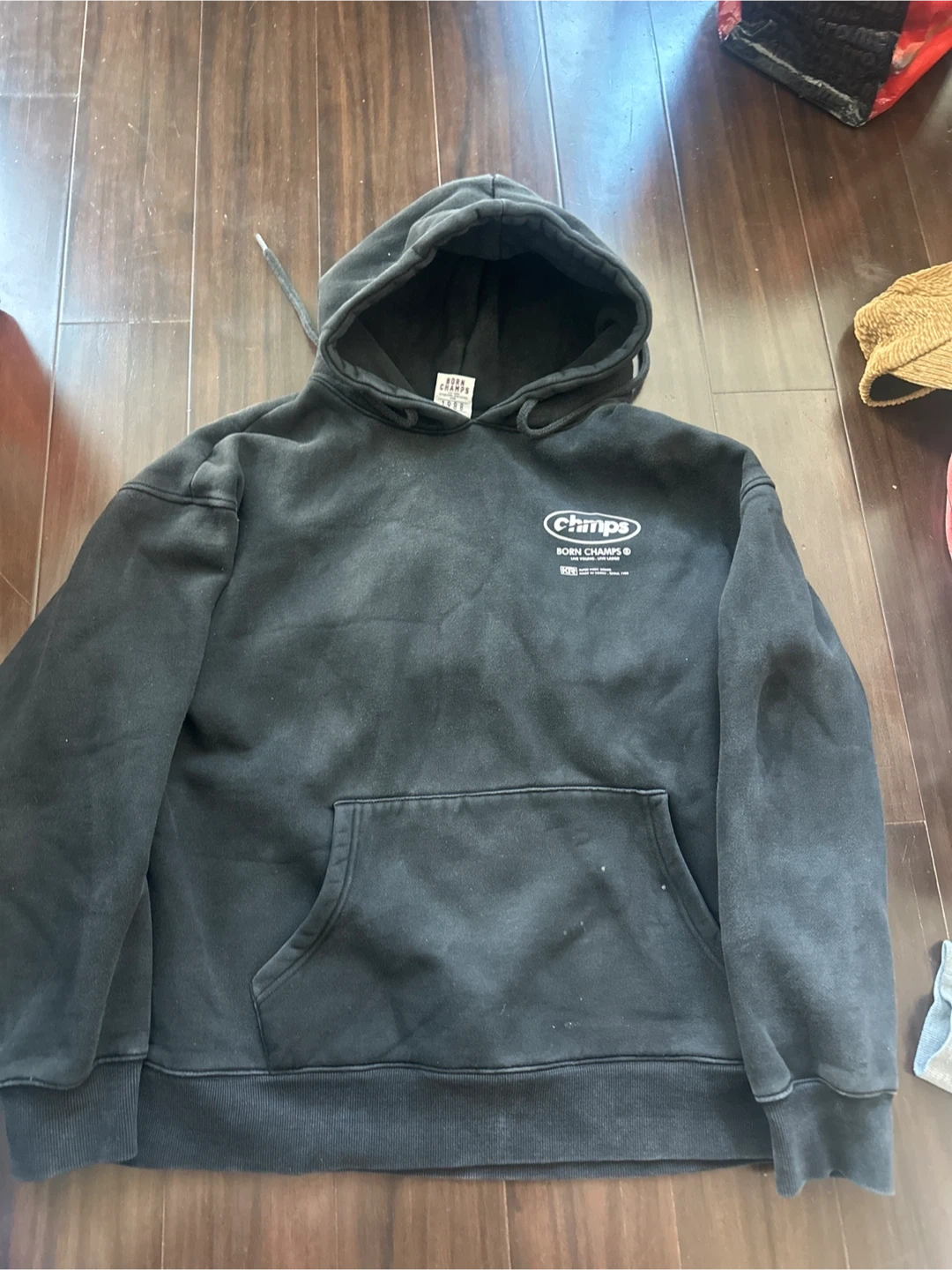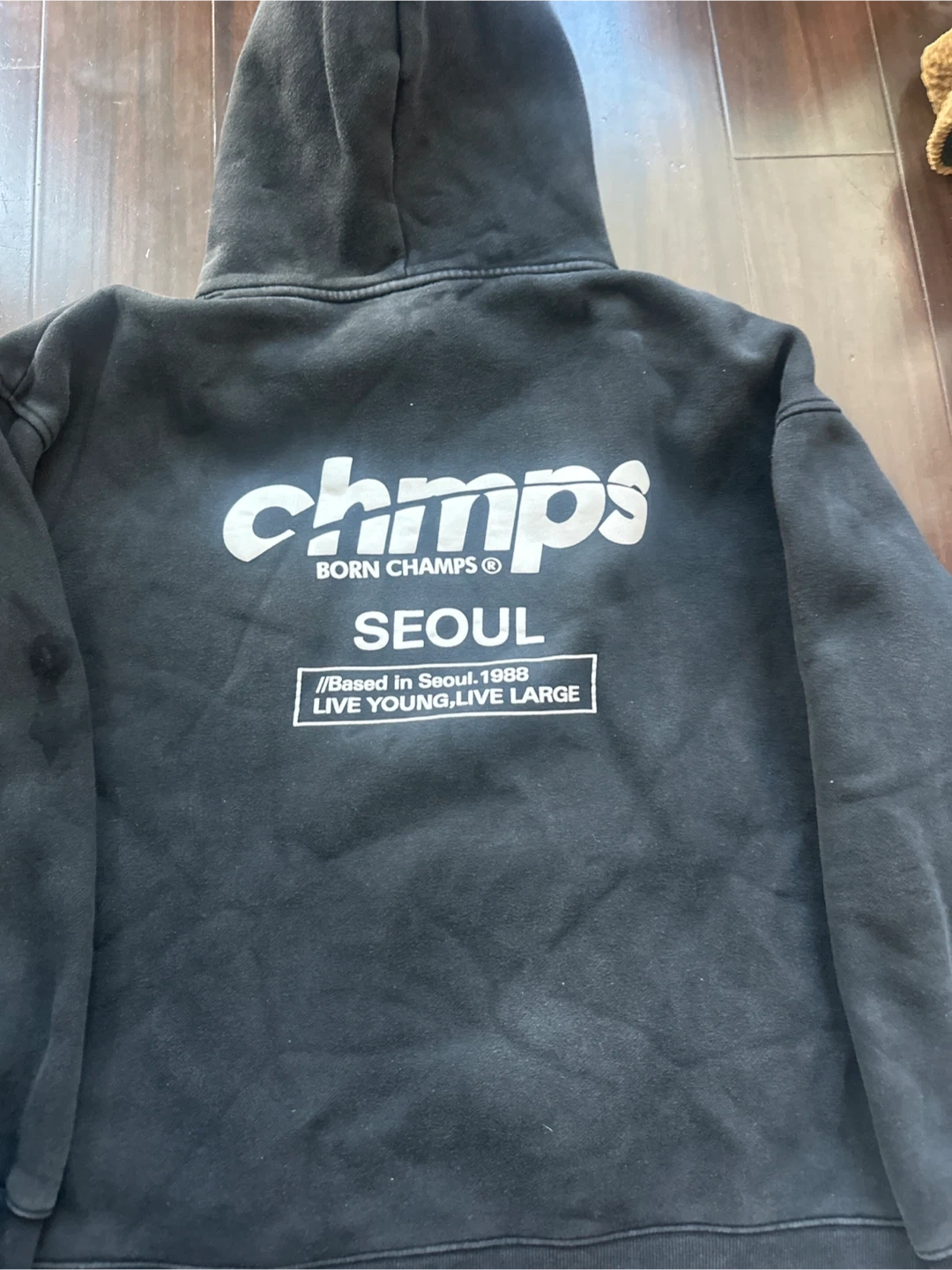 Selling a Chmps hoodie in black! The size isn't marked, but it looks to be in good condition. The design says "Born Champs, Seoul, Based in Seoul 1988, Live Young, Live Large"