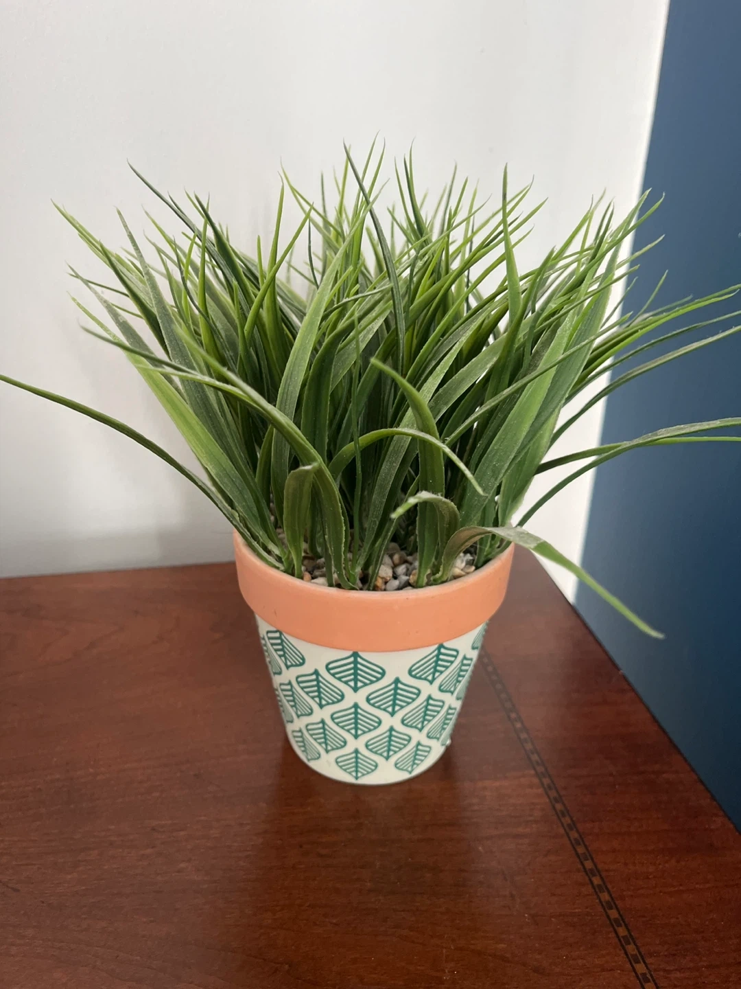 Selling a cute artificial potted plant! It's perfect for adding a touch of greenery to any room without the hassle of maintenance. The pot has a charming leaf pattern.