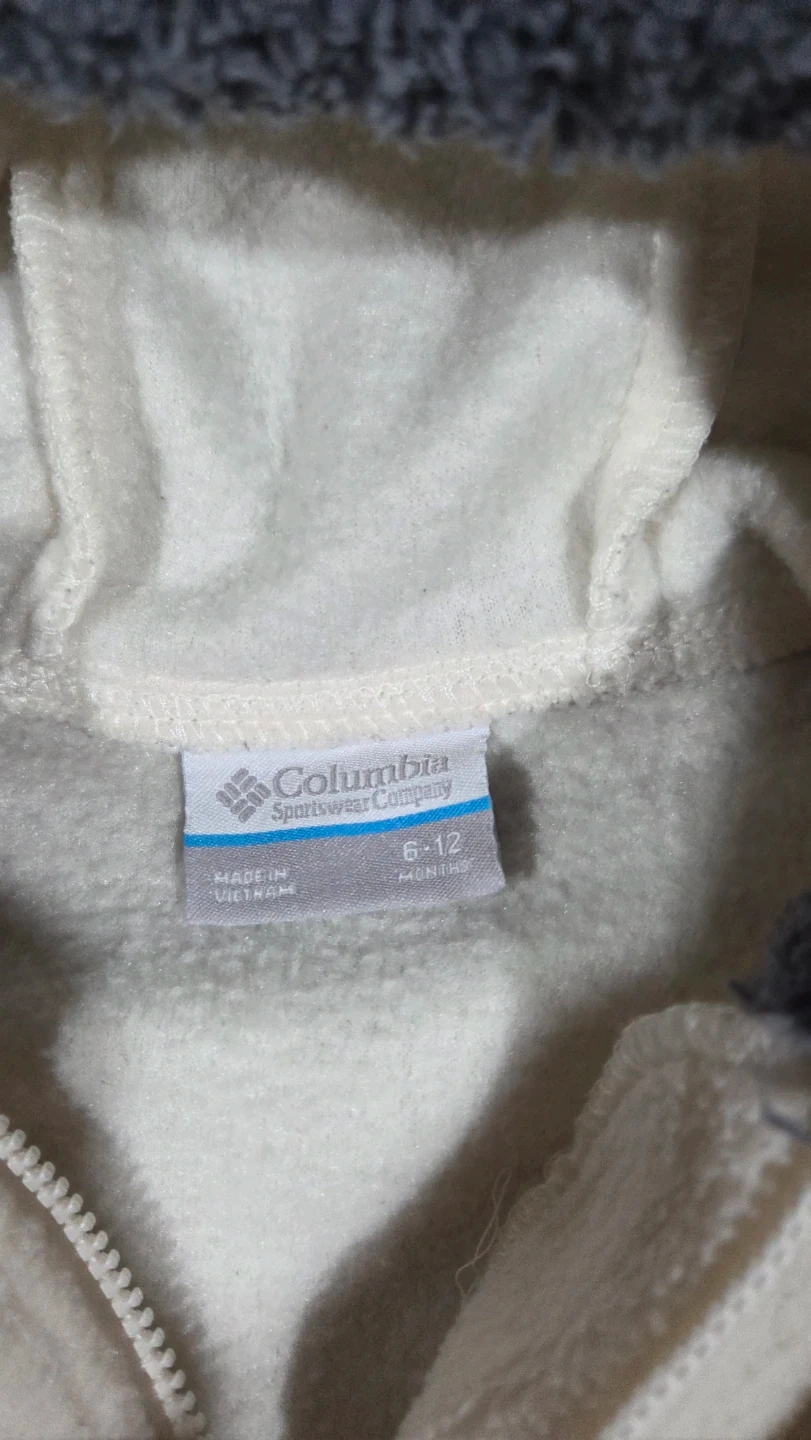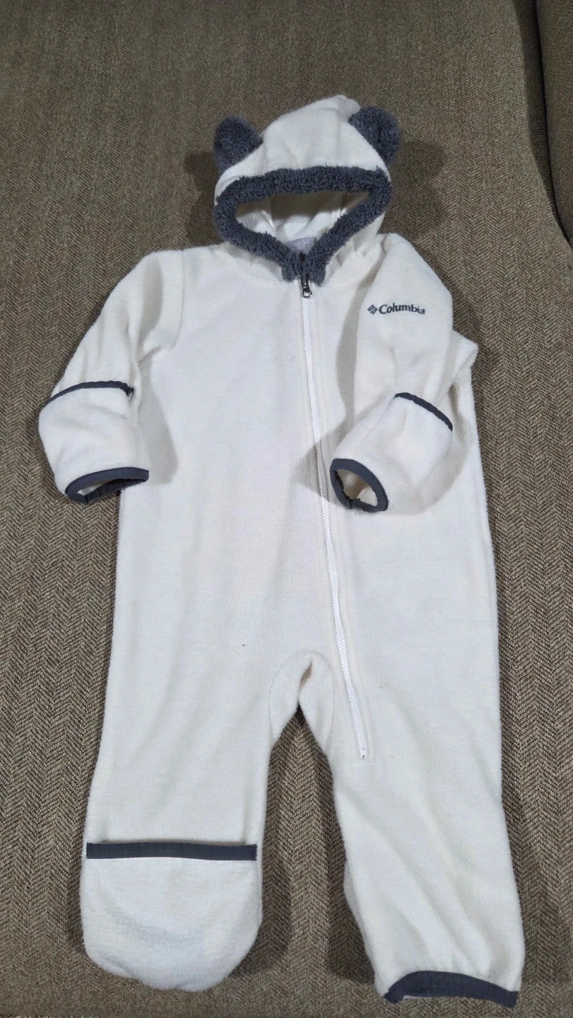 Selling a cute Columbia bear onesie! It's white with grey accents and has a hood with bear ears. Size is 6-12 months, perfect for keeping your little one warm and cozy