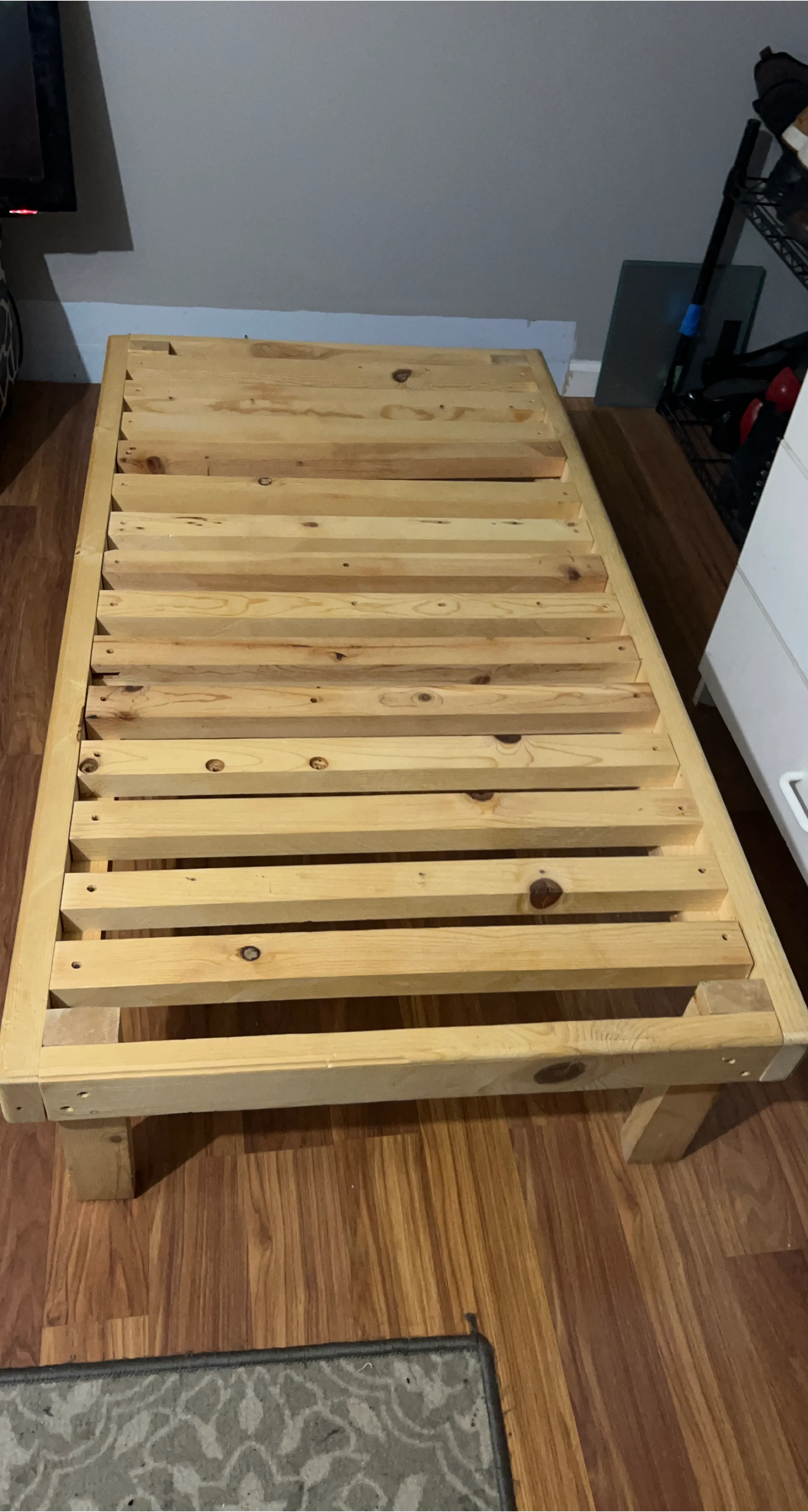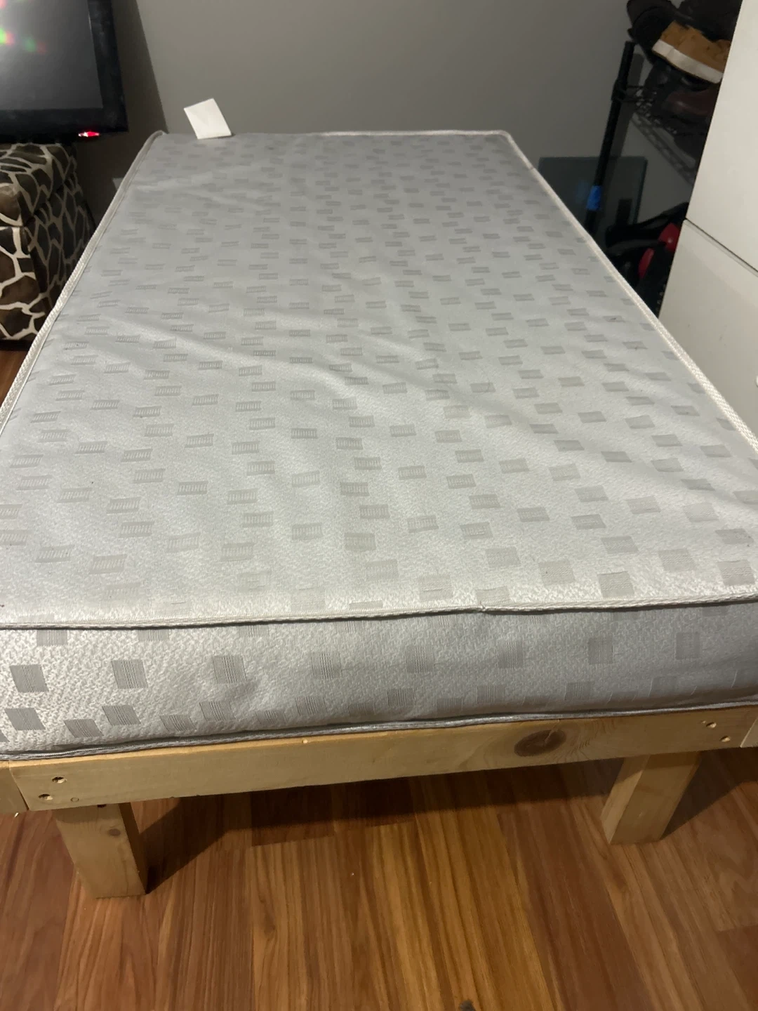 Selling a wooden bed frame that's in good condition. It comes with a mattress. The frame is made of light-colored wood and has a simple, sturdy design. Perfect for a small space! The custom size is 28 inches wide by 51 inches long.