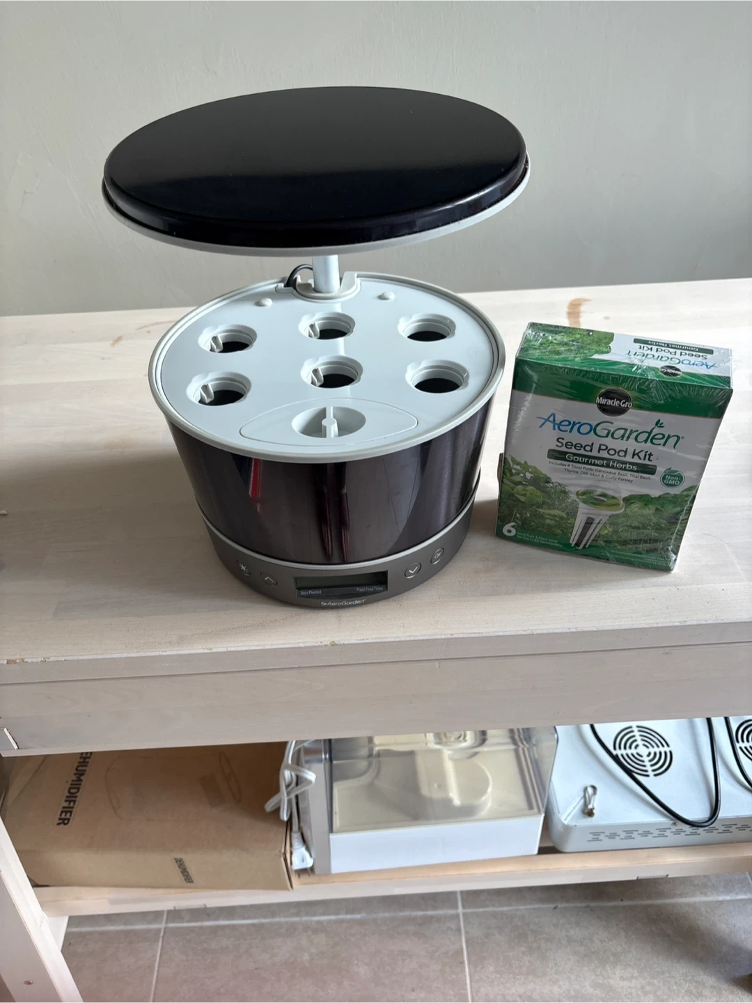 I'm selling a Miracle-Gro AeroGarden along with a Gourmet Herbs Seed Pod Kit! It's a great way to grow herbs indoors all year round. The kit includes 6 seed pods with herbs like Genovese Basil, Thai Basil, Mint, Curly Parsley and Dill.