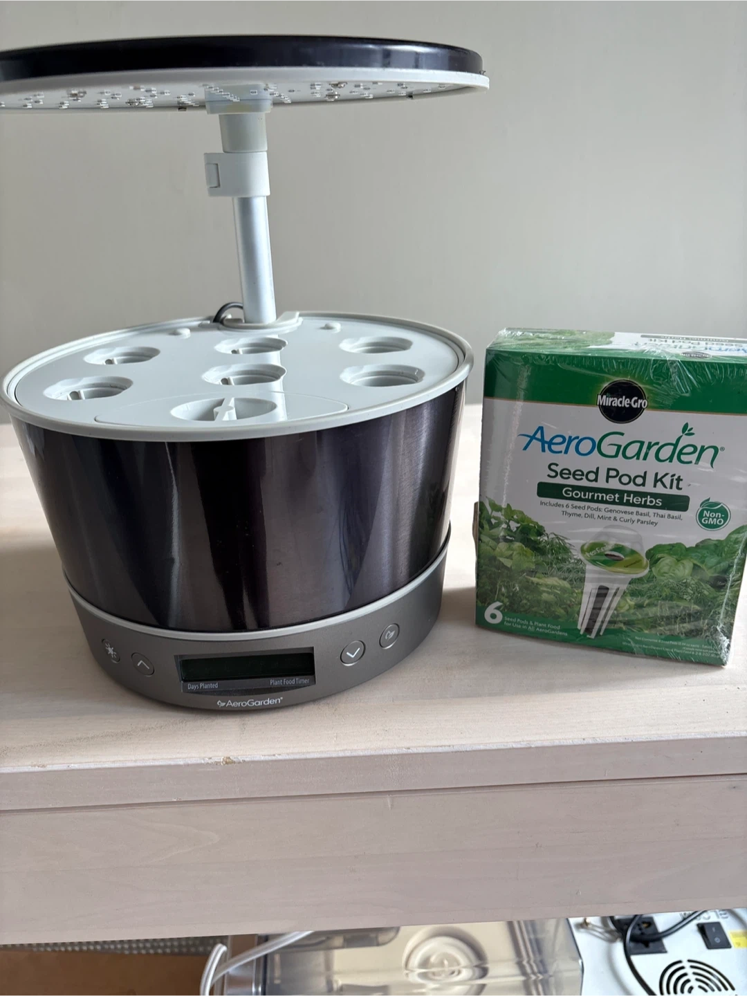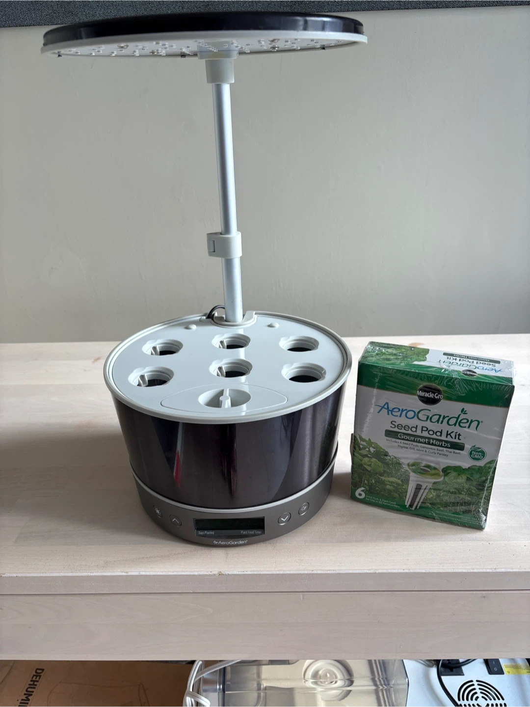 I'm selling a Miracle-Gro AeroGarden along with a Gourmet Herbs Seed Pod Kit! It's a great way to grow herbs indoors all year round. The kit includes 6 seed pods with herbs like Genovese Basil, Thai Basil, Mint, Curly Parsley and Dill.