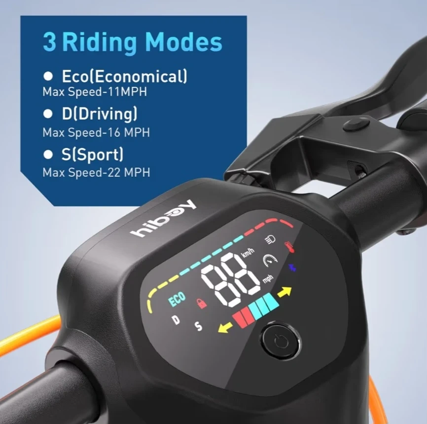 Looking to sell my Hiboy MAX Pro electric scooter! It features 3 riding modes: Eco (max speed 11 MPH), D (max speed 16 MPH), and S (max speed 22 MPH). Recommended height is 5'4"-6'4" and the scooter weight is 51.59 lbs. The load capacity is 256 lbs