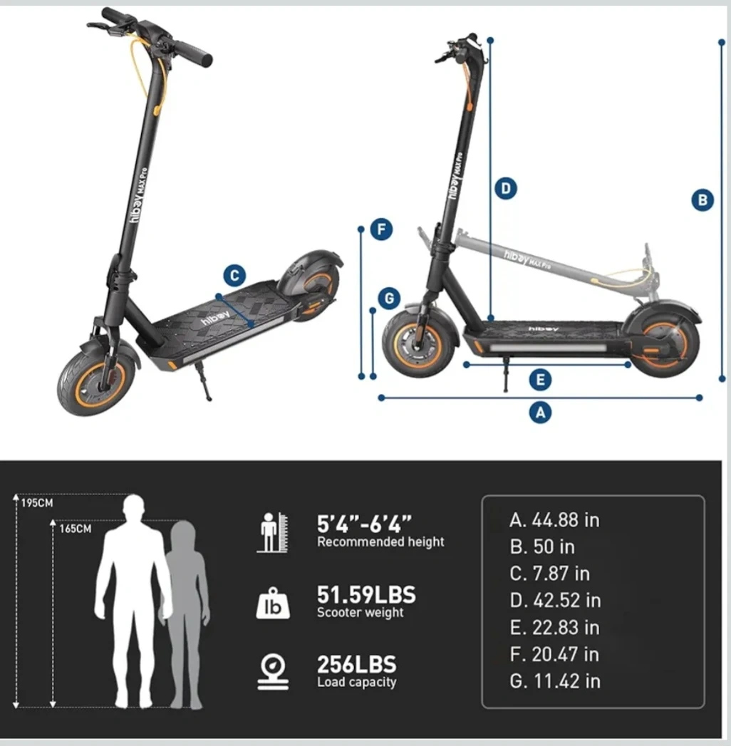 Looking to sell my Hiboy MAX Pro electric scooter! It features 3 riding modes: Eco (max speed 11 MPH), D (max speed 16 MPH), and S (max speed 22 MPH). Recommended height is 5'4"-6'4" and the scooter weight is 51.59 lbs. The load capacity is 256 lbs