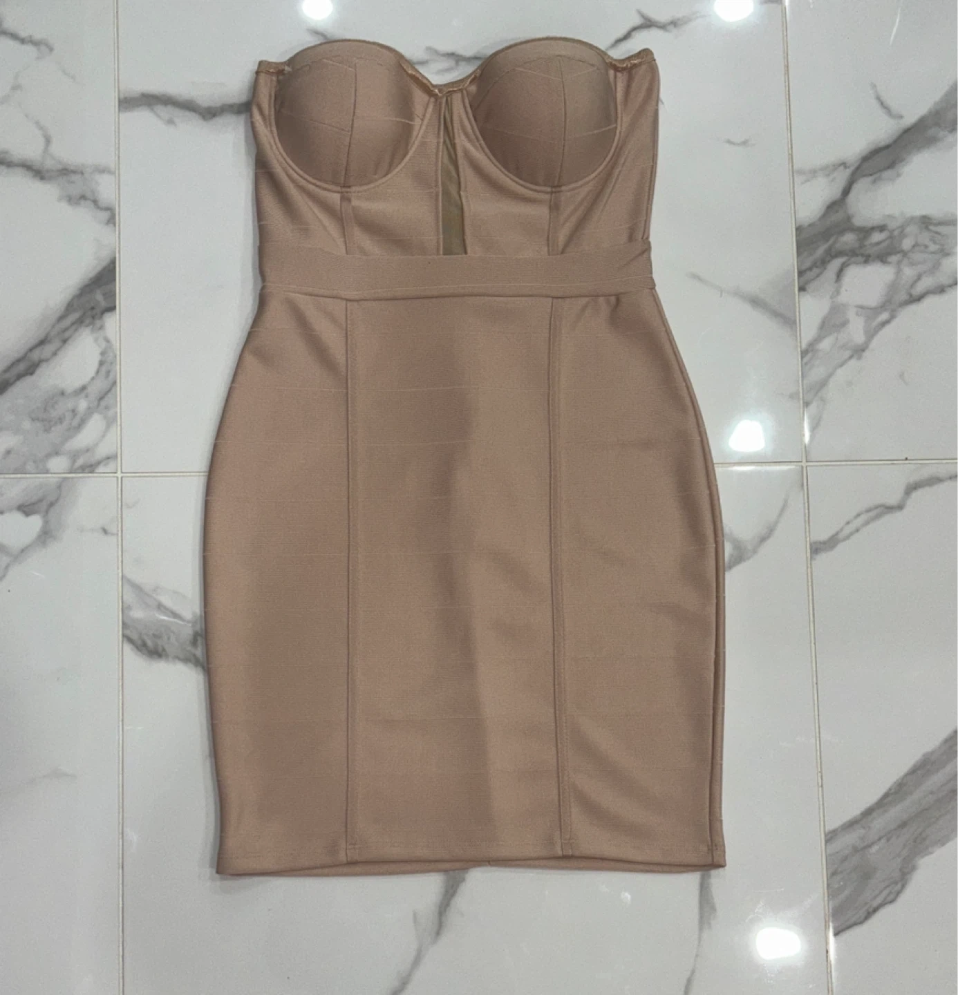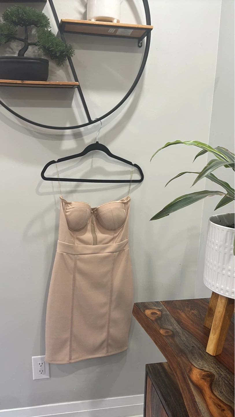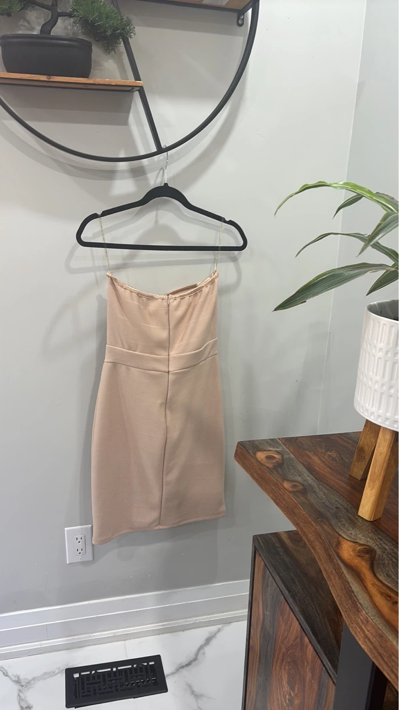 Selling a cute beige strapless mini dress! It's in great condition and ready for a new owner. Perfect for a night out or a special occasion. It's a strapless style.