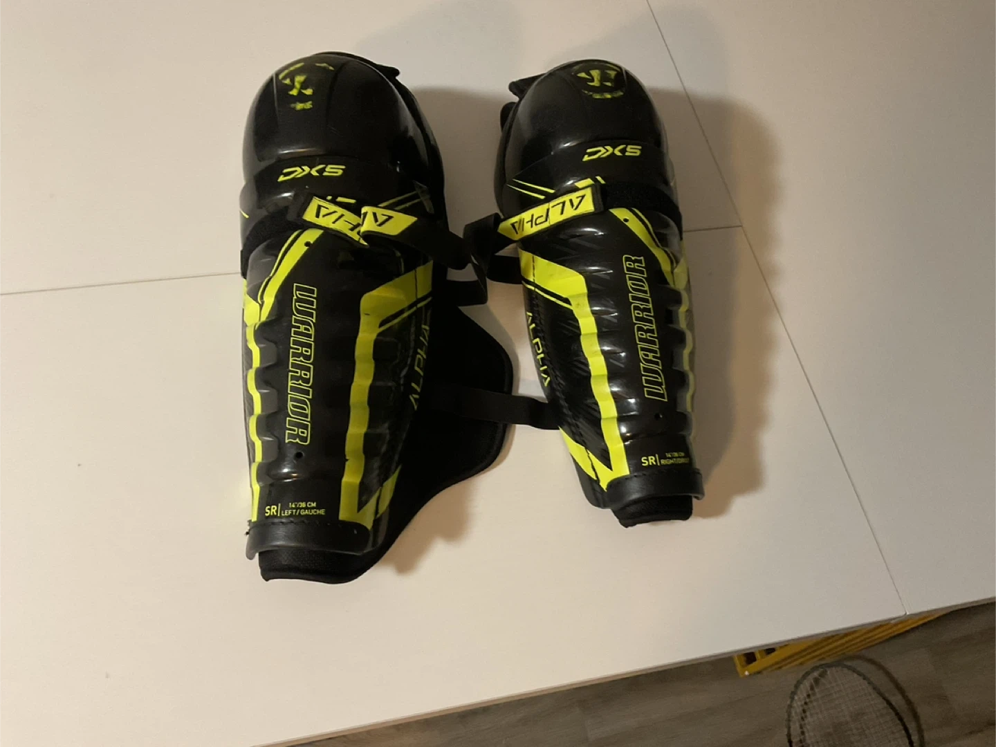 Selling a pair of Warrior Alpha DX5 shin guards in senior size. They are black with yellow accents and in great shape. Perfect for hockey!