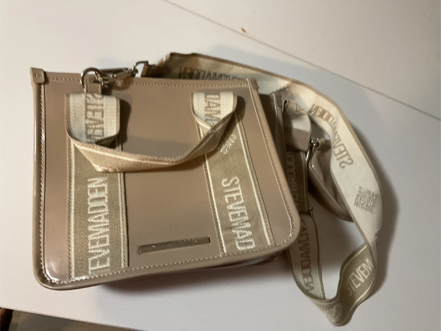 Selling a cute Steve Madden crossbody bag! It's in great condition and perfect for everyday use. The bag is beige with the Steve Madden logo on the strap and front. It's a stylish and practical accessory to add to your collection