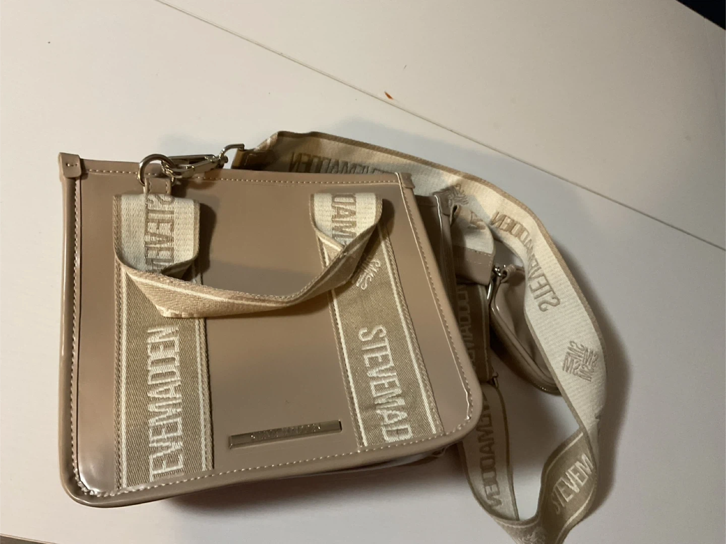 Selling a cute Steve Madden crossbody bag! It's in great condition and perfect for everyday use. The bag is beige with the Steve Madden logo on the strap and front. It's a stylish and practical accessory to add to your collection