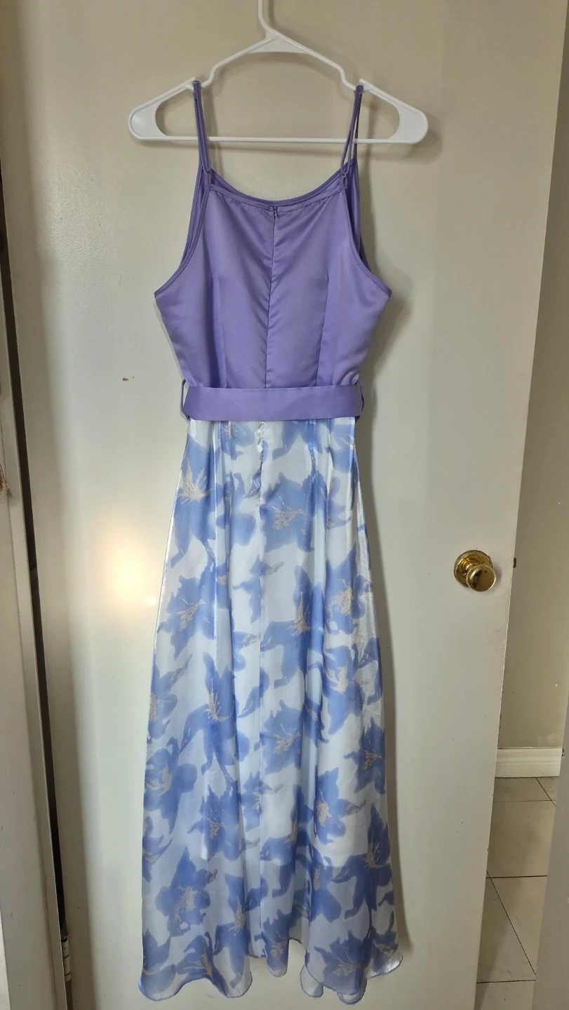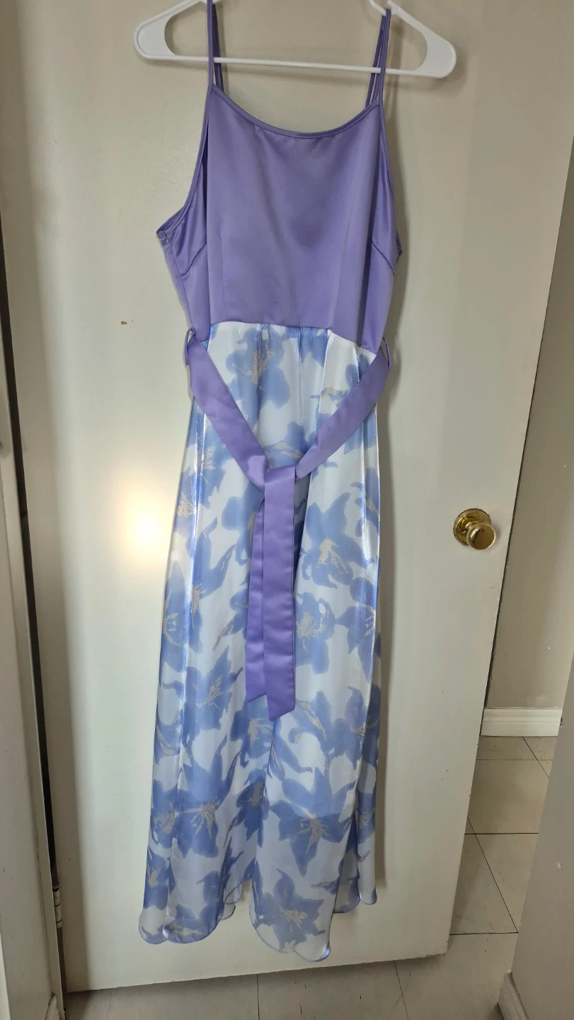 Selling a lovely floral maxi dress in size XL (12). The dress features a light purple top and a beautiful blue and white floral print on the skirt. It also has a matching belt to cinch the waist. Perfect for summer or a special occasion! Wedding guest!
