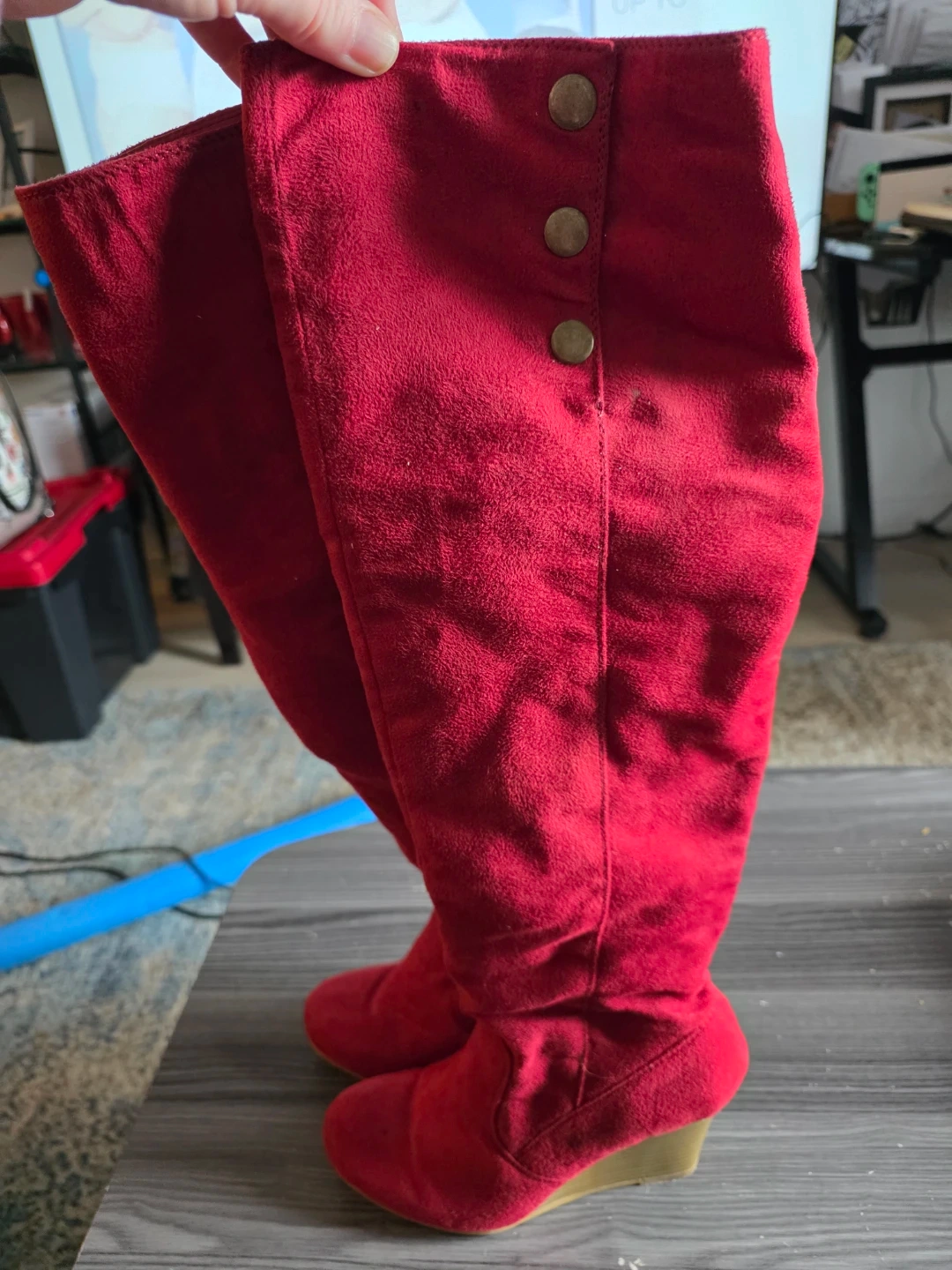 Selling a pair of red knee-high boots! They have a cute button detail and a small wedge heel. Great for adding a pop of colour to your outfit