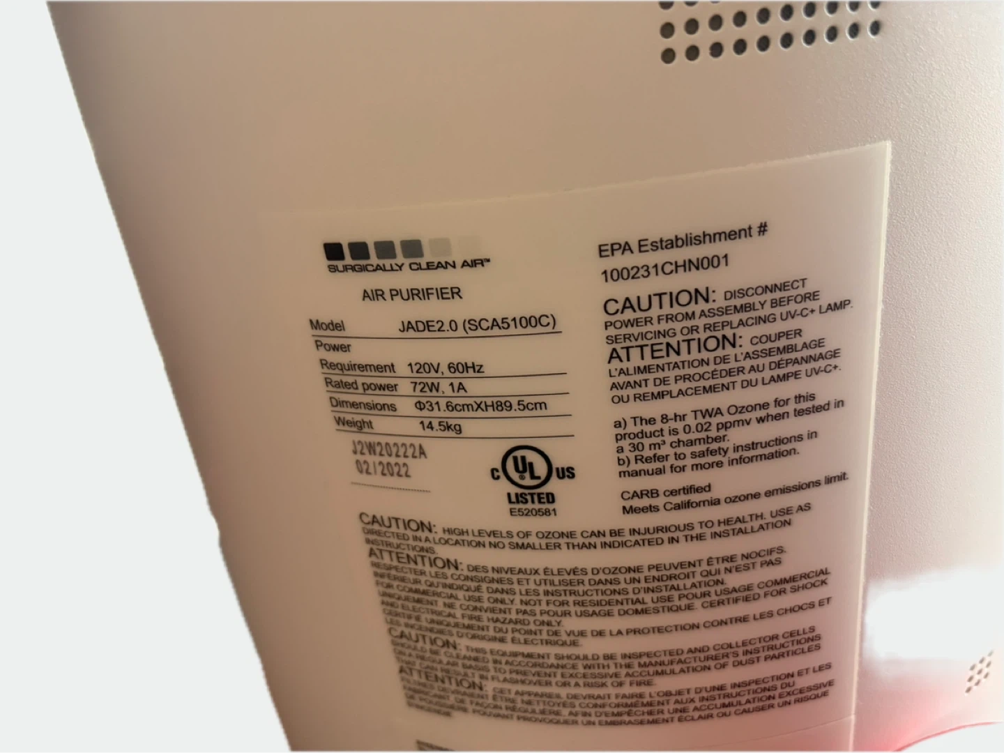Premium Surgically Clean Air Jade 2.0 air purifier (model SCA5100C / JADE 2.0S-GS100) – excellent used condition!