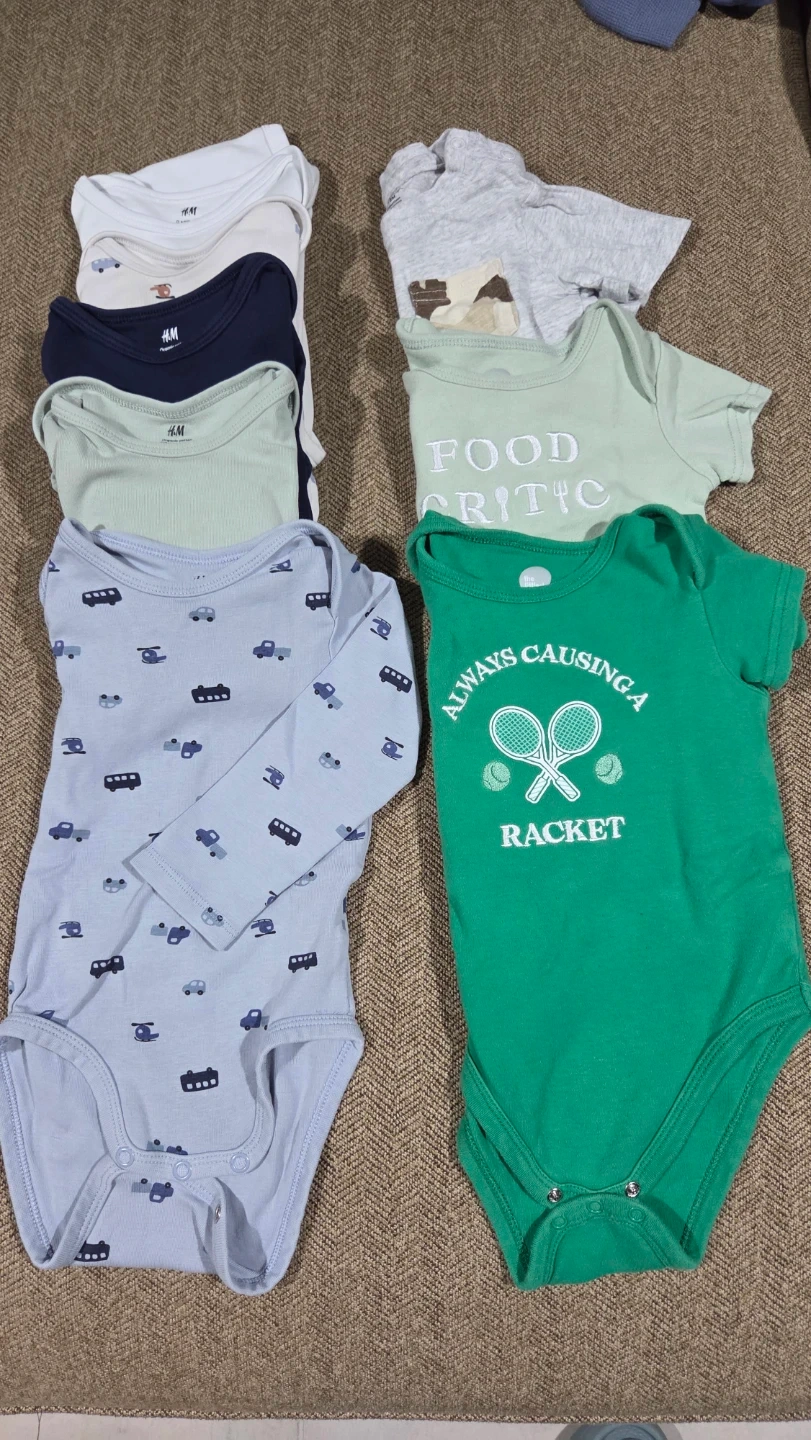 A collection of baby bodysuits in various colours and designs! There are H&M bodysuits in white, navy, and light green. Also included are bodysuits with fun prints like cars and a 'Food Critic' design. All in great condition and ready for your little one!