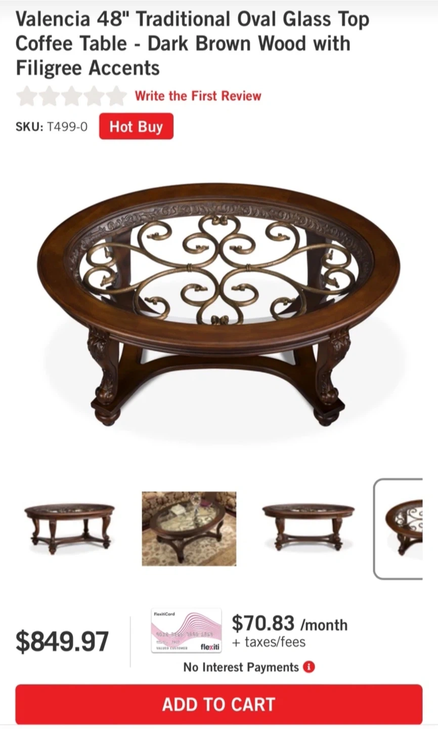 Selling a Valencia 48" traditional oval glass top coffee table. It features a dark brown wood frame with filigree accents.