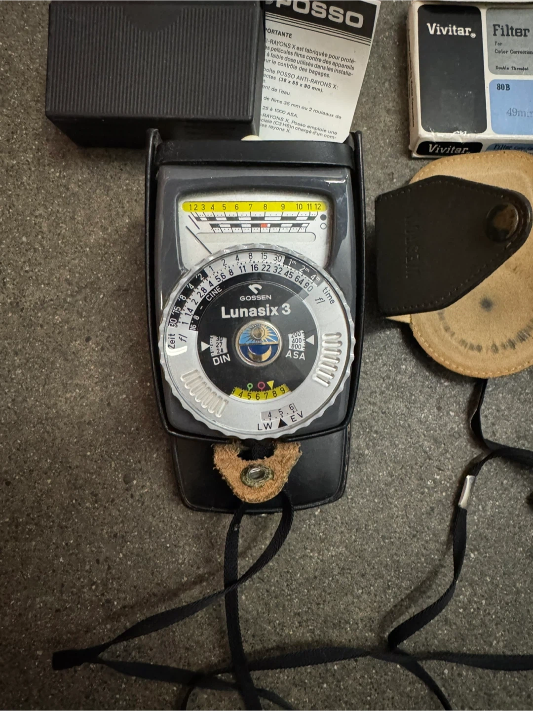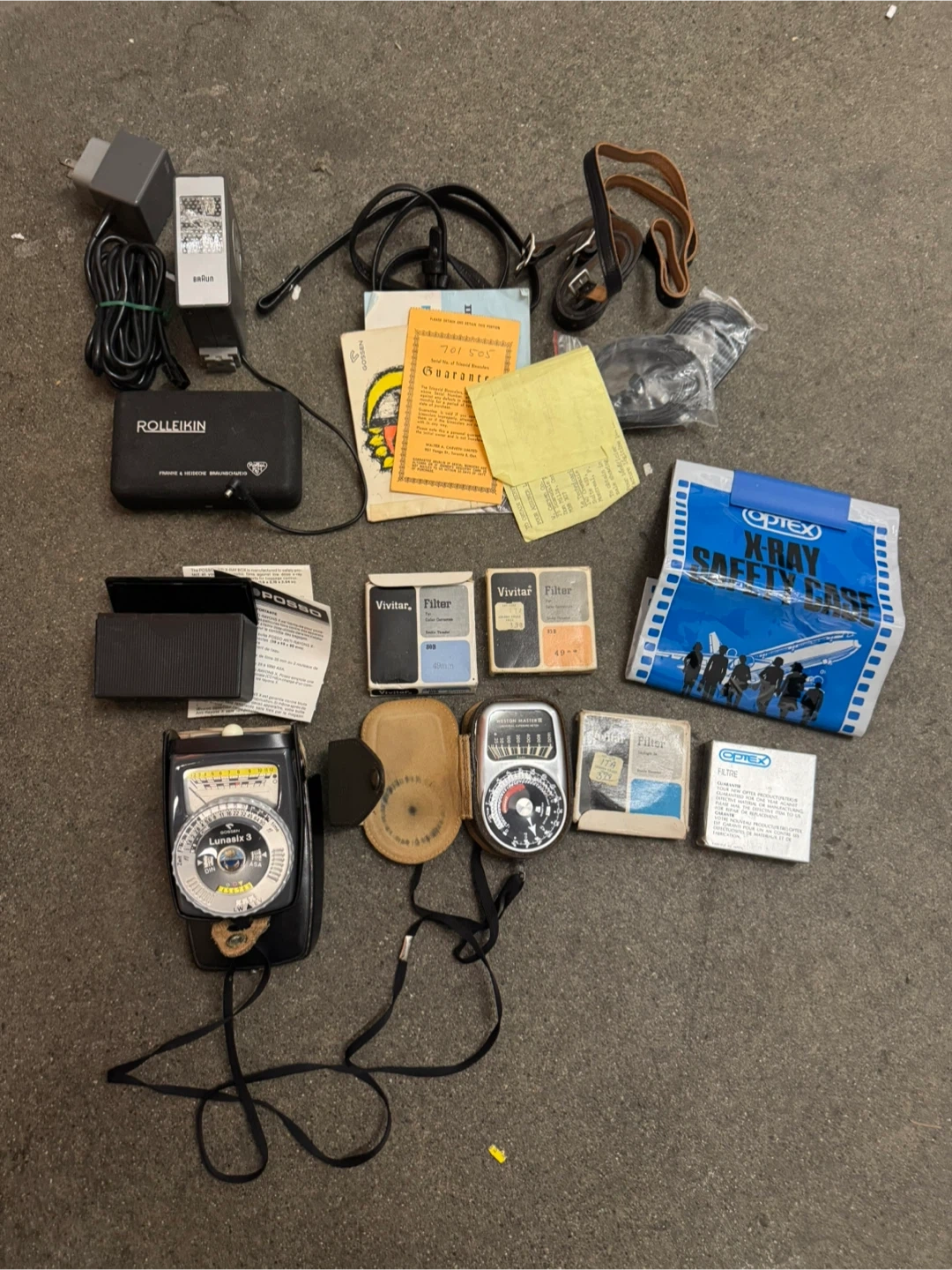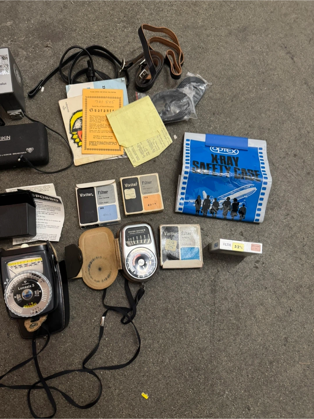 Selling a vintage camera gear - light meters Vivitar filters and a Rolleikin adapter. The set also includes an Optex X-Ray safety case. Great for photography enthusiasts!