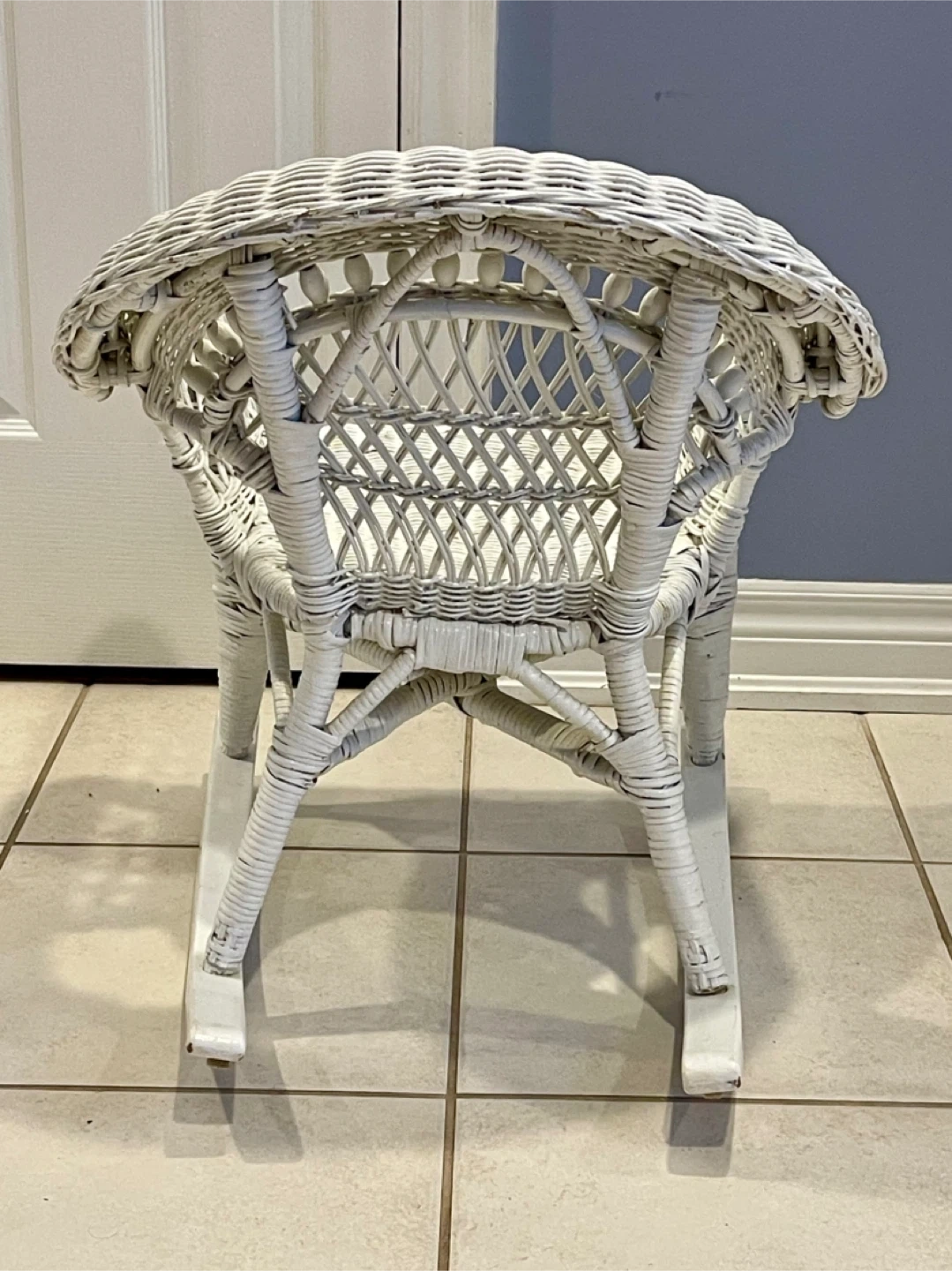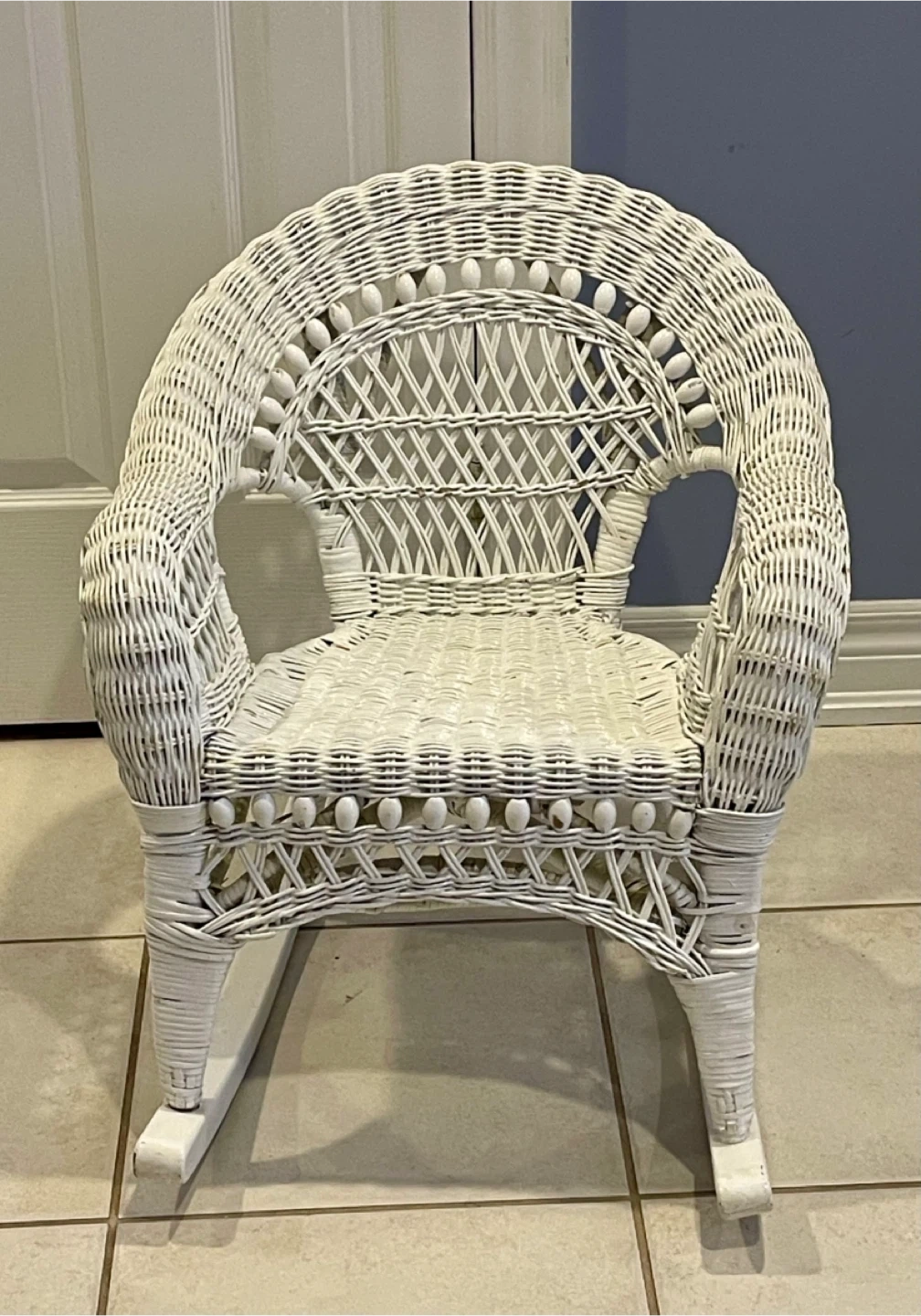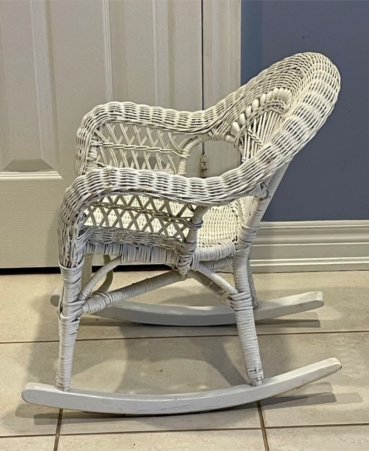 Here's a cute little white wicker rocking chair! It's in great shape and would be perfect for a kid's room or as a decorative piece. It has a classic woven design and a smooth rocking motion.
