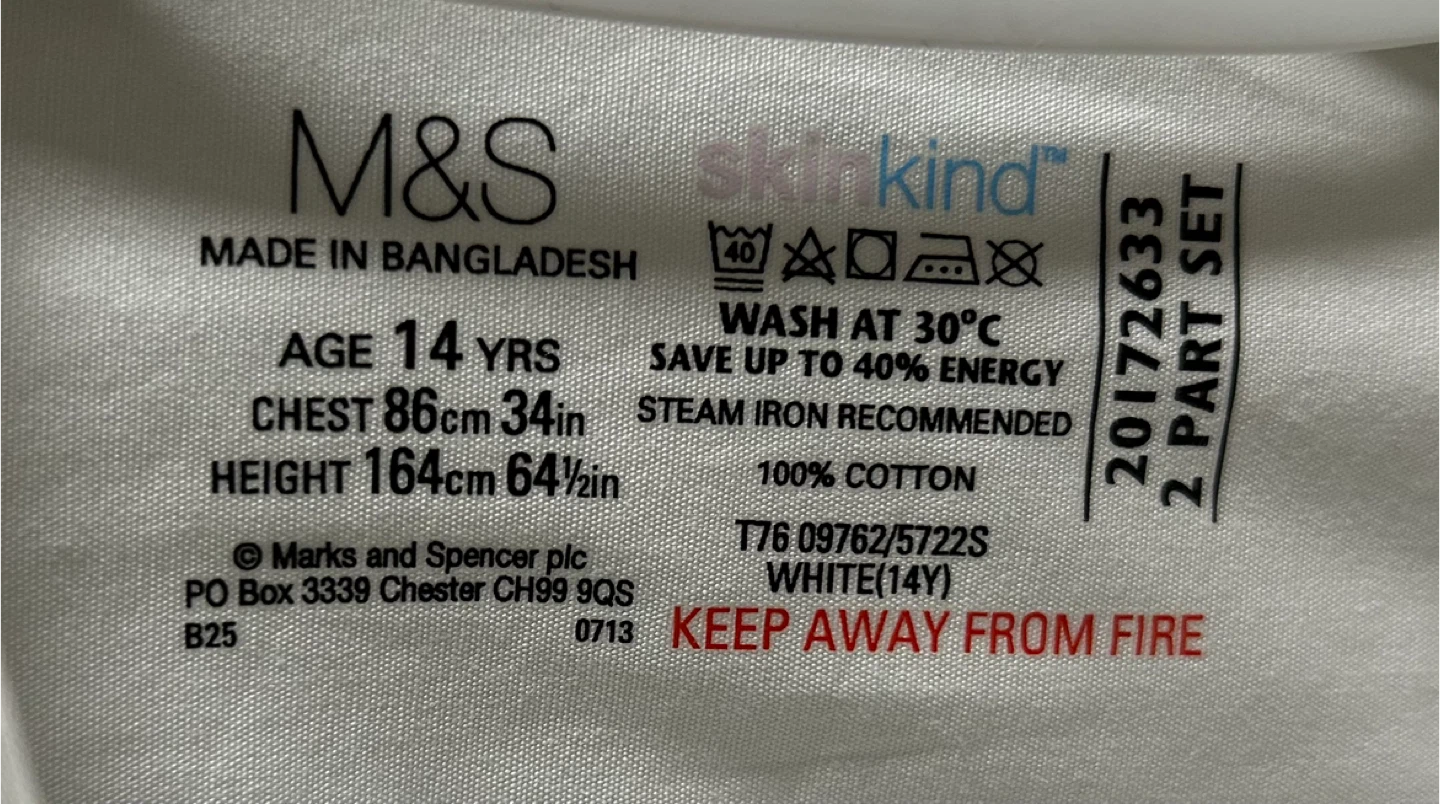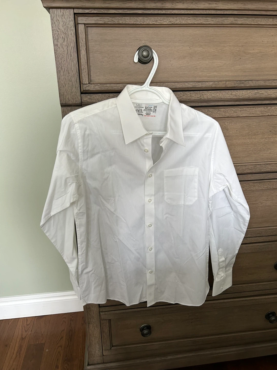 Here's a nice white shirt from M&S, perfect for a 14-year-old. It's made of 100% cotton. The chest size is 86cm (34in) and the height is 164cm (64 1/2in)