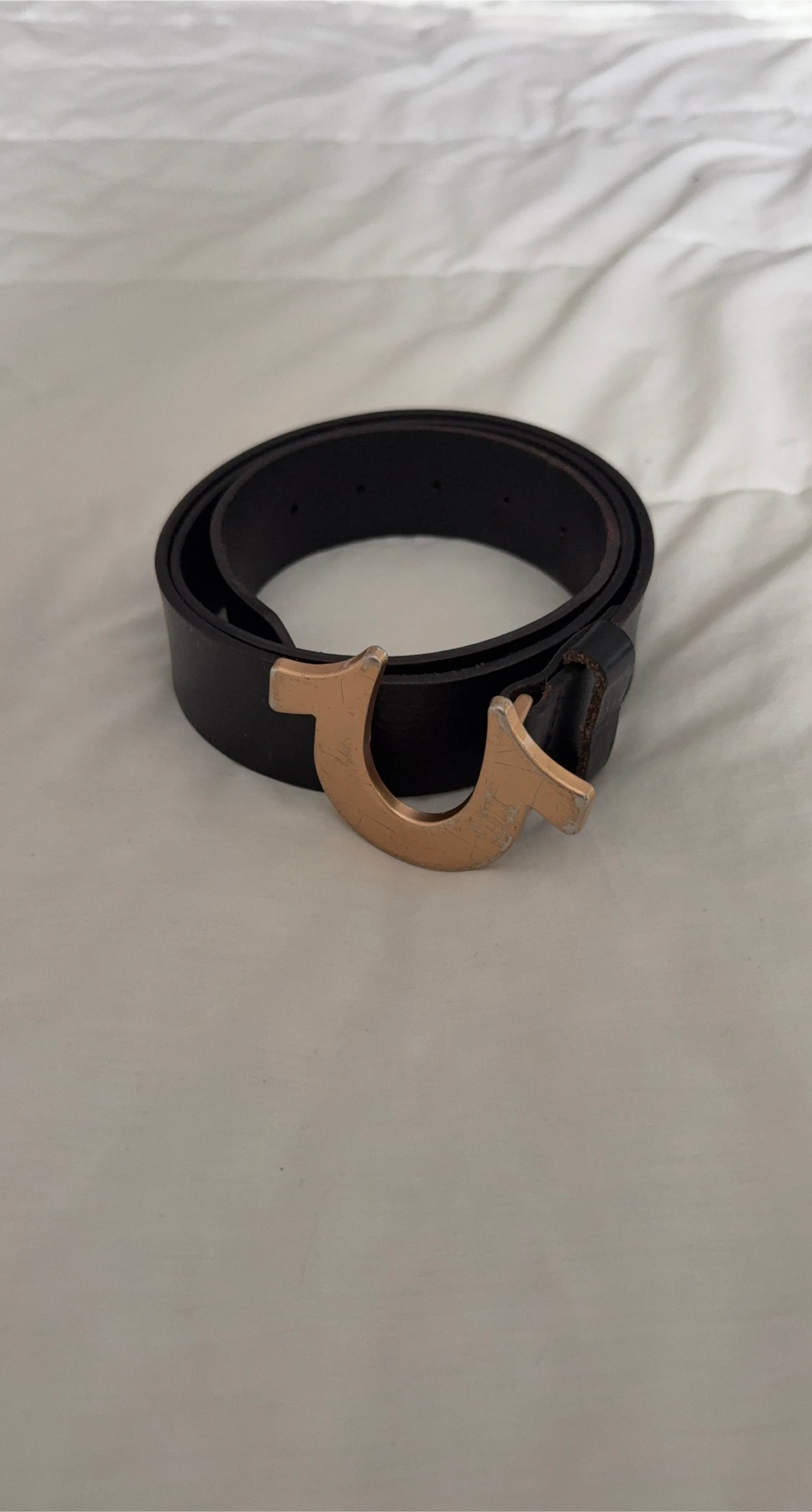 Selling a True Religion black leather belt with a gold-tone buckle. It has some signs of wear on the buckle, as shown in the pictures. It's a stylish accessory to complete your outfit!