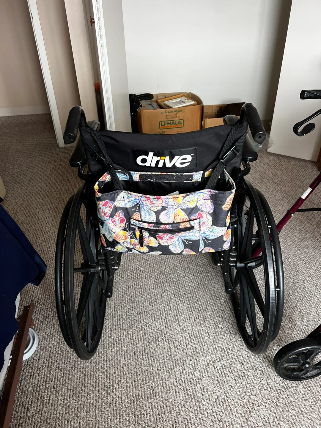 Selling a Drive wheelchair in good condition! It comes with a cute butterfly print bag attached to the back for storage. Perfect for anyone needing mobility assistance.