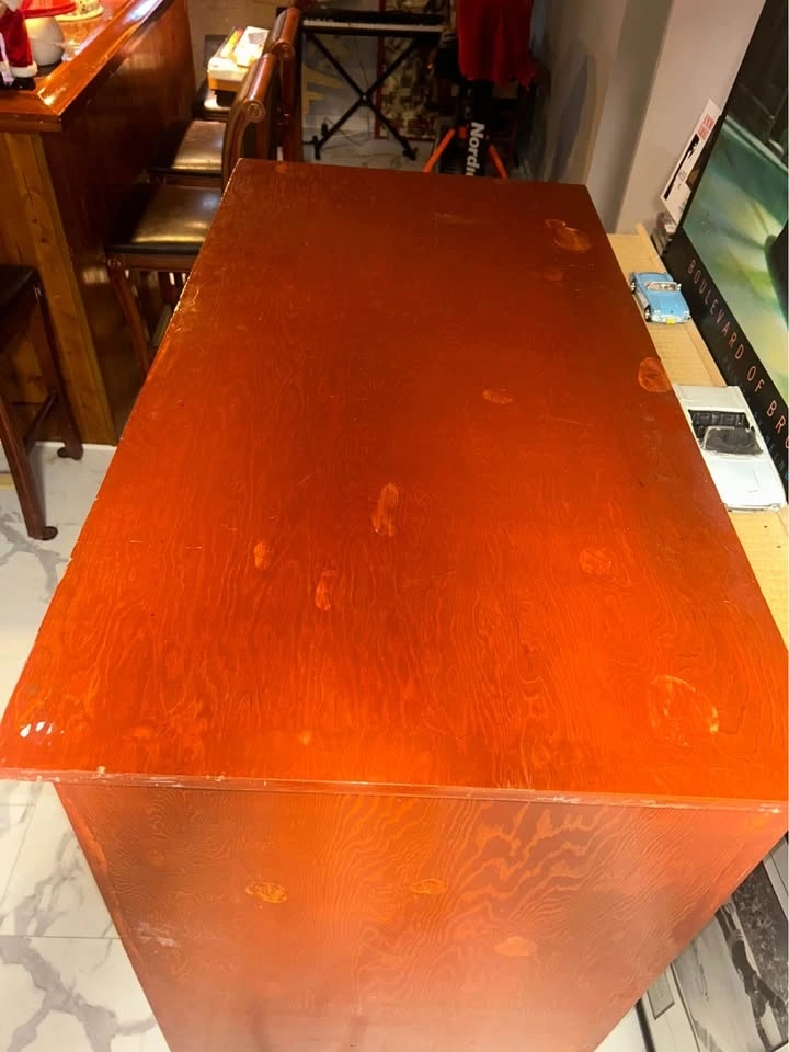 Large, solid wood shelving unit in great structural condition. This unit includes 2 large storage shelves on the bottom, 2 medium storage shelves in the middle, and 2 small storage shelves on the top.