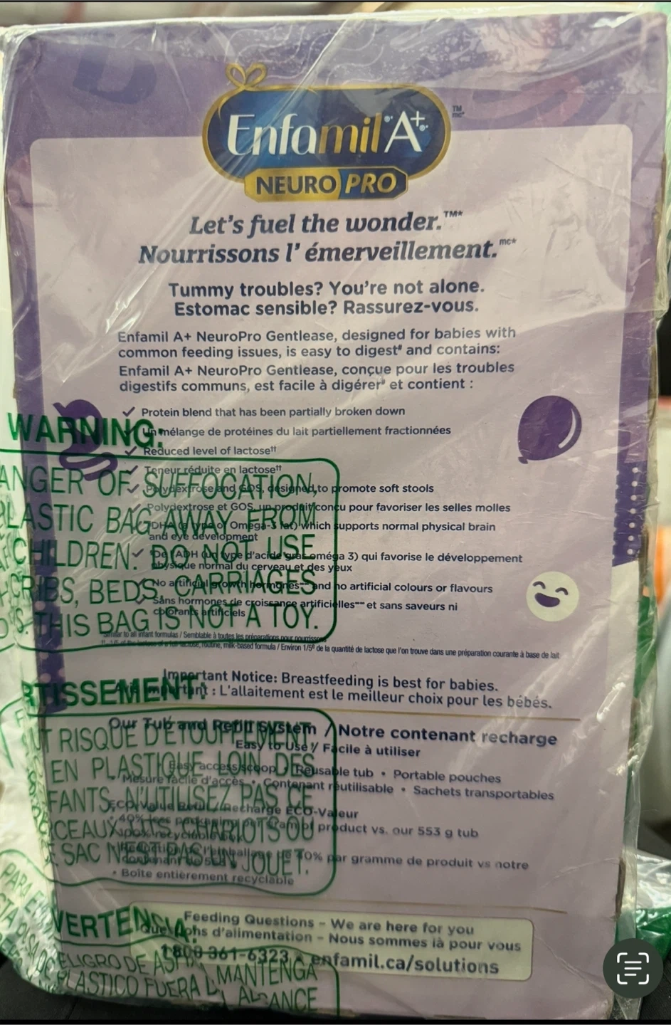 Selling a Enfamil A+ NeuroPro Gentlease baby formula. This powder formula is designed for babies with common feeding issues and is easy to digest. It's suitable for babies aged 0-12 months and contains DHA and HuMO6. The expiration date is 2026 July 01