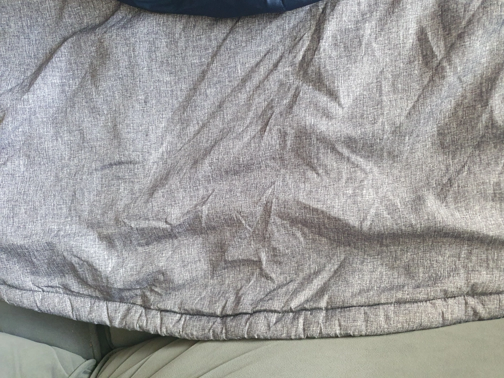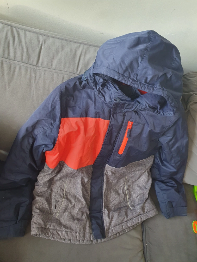 Here's a warm winter jacket in navy, orange and grey. It's in good condition and ready for some winter fun!
