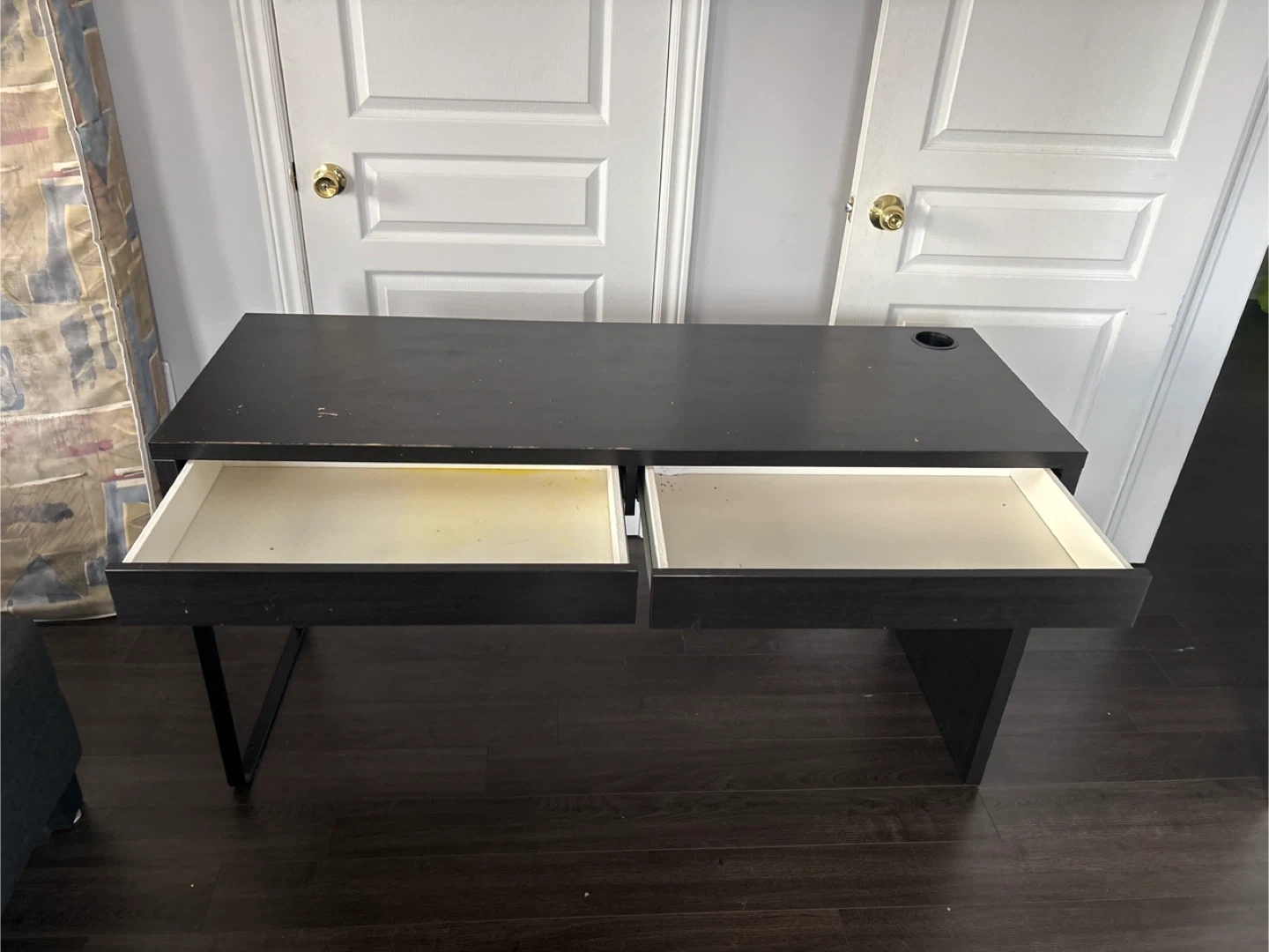Selling a simple black desk, perfect for a home office or student space. It has a couple of drawers for storage. It's in good condition and ready for a new home!