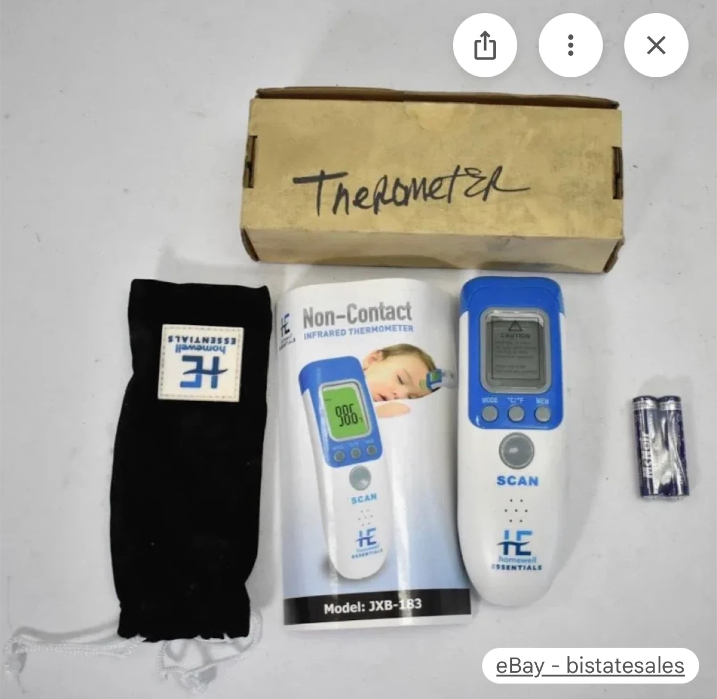 Selling a Homewell Essentials non-contact infrared thermometer, model JXB-183. It comes with the original box, a carrying pouch, and the instruction manual. It's in great condition and ready to use!