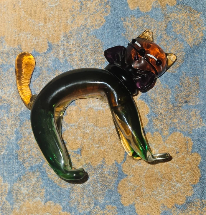 Here's a unique glass blown cat figurine by Murano! It features a blend of colors and a playful design. It's a charming piece for any cat lover or collector of glass art