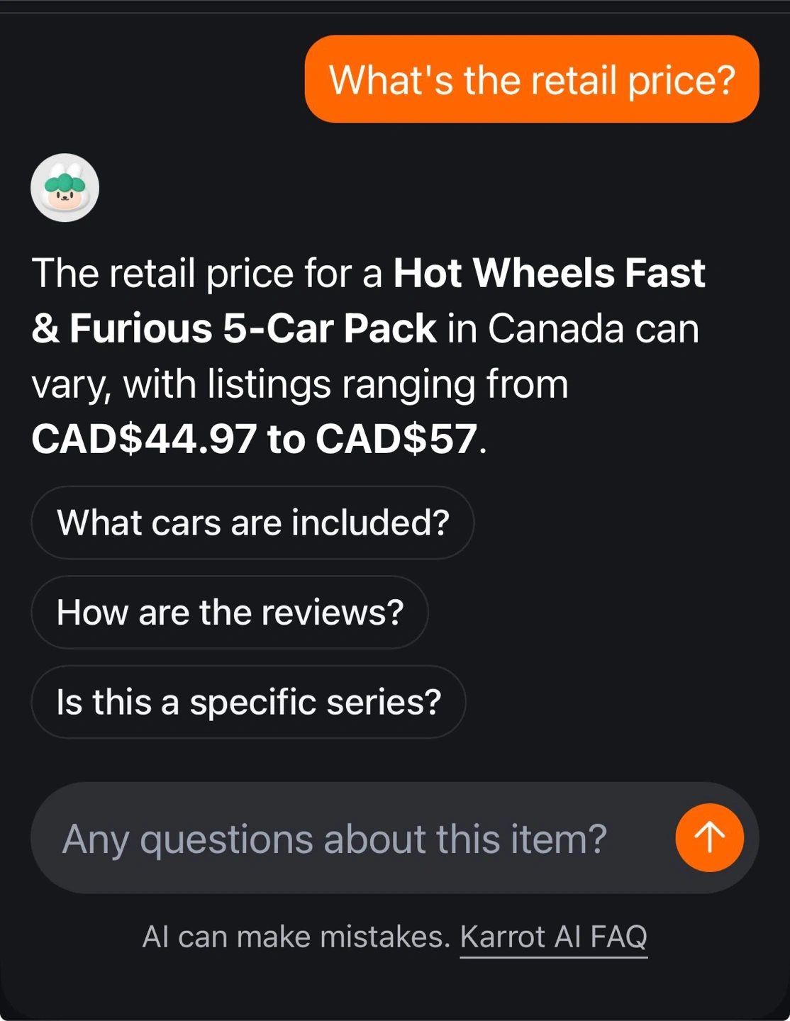 Buy & SellHot Wheels Fast & Furious 5-Car PackHot Wheels Fast & Furious 5-Car Pack$25Hot Wheels Fast & Furious 5-car pack! The cars are in their original packaging. Mint condition. $25 No holdsWHERE TO MEETCheck LocationView MapSELLERTimRiley Park575 reviews0 chats·0 favorites·18 viewsSEND CHAT TO SELLERHi Tim! I’m interested in your listing.Hi Tim! I’m interested in your listing.Get the Karrot app to chatSign In to chat