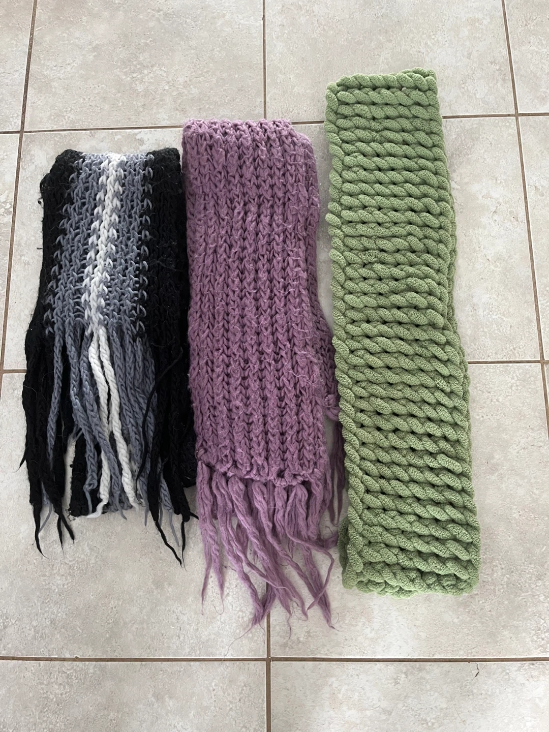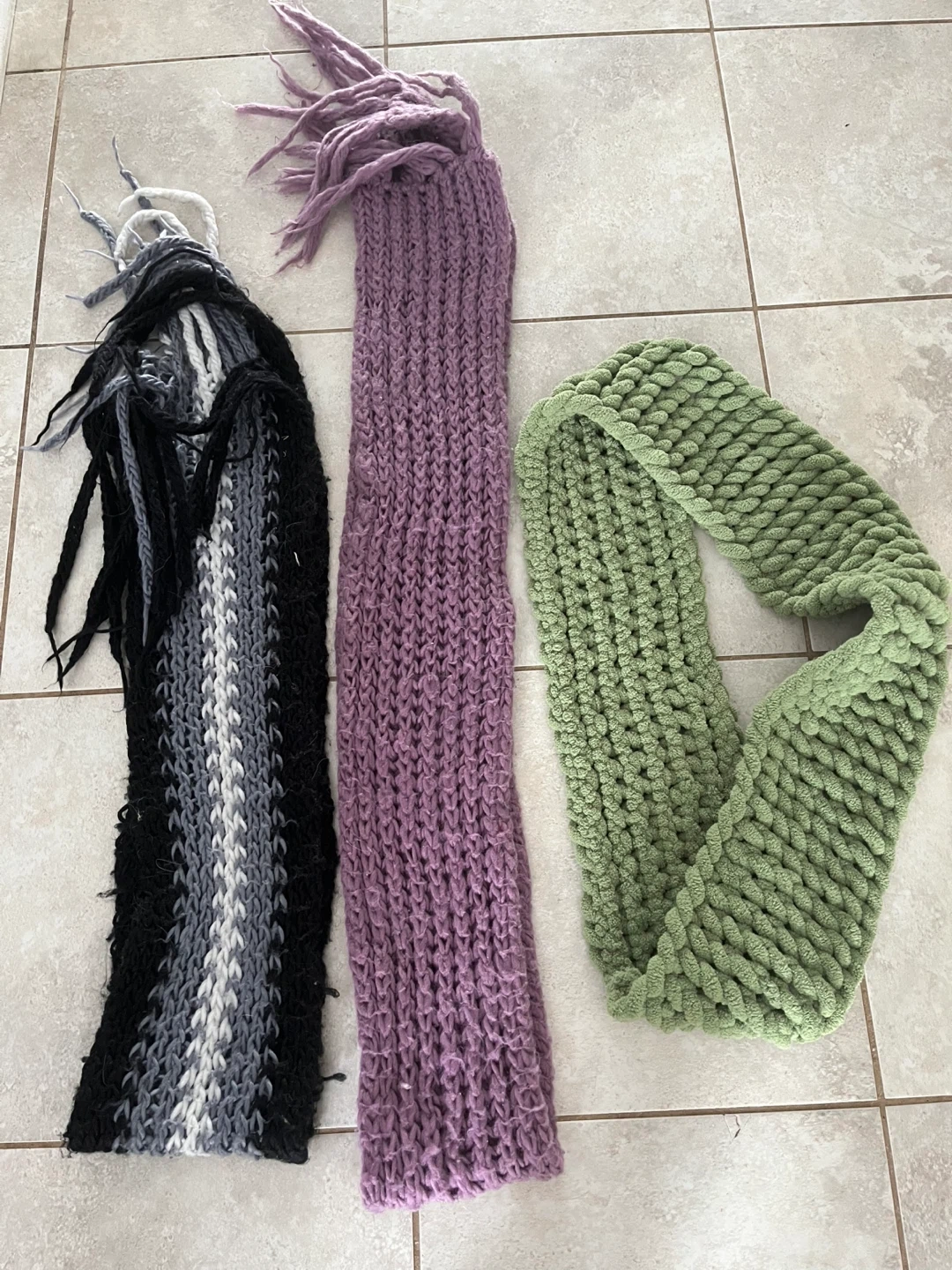 Selling three handmade scarves! One is black and grey with fringe, another is a lovely purple with fringe, and the last is a cozy green. All are in great condition and ready to keep you warm this winter!
