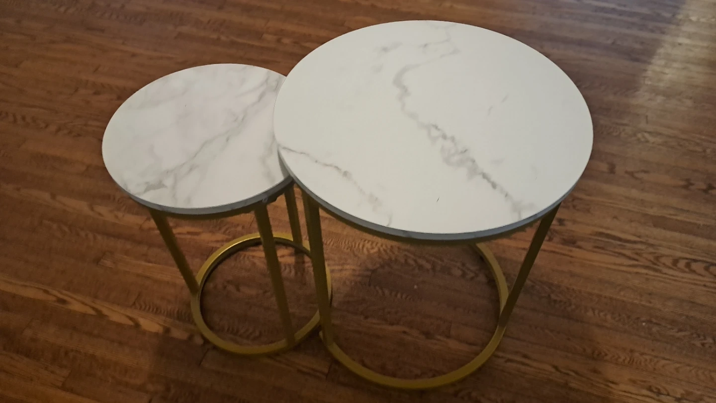 Selling a set of two living room tables! The tables have a faux marble top and gold-tone metal frames. The larger table is about 23.6 inches in diameter and 17.7 inches tall, while the smaller one is about 15.7 inches in diameter and 15.7 inches tall. Great for adding a modern touch to your living space