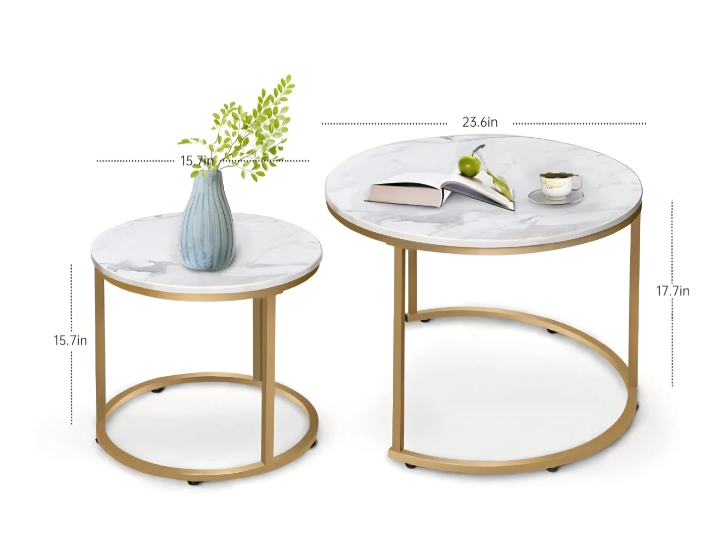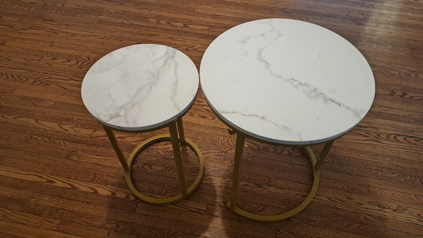 Selling a set of two living room tables! The tables have a faux marble top and gold-tone metal frames. The larger table is about 23.6 inches in diameter and 17.7 inches tall, while the smaller one is about 15.7 inches in diameter and 15.7 inches tall. Great for adding a modern touch to your living space