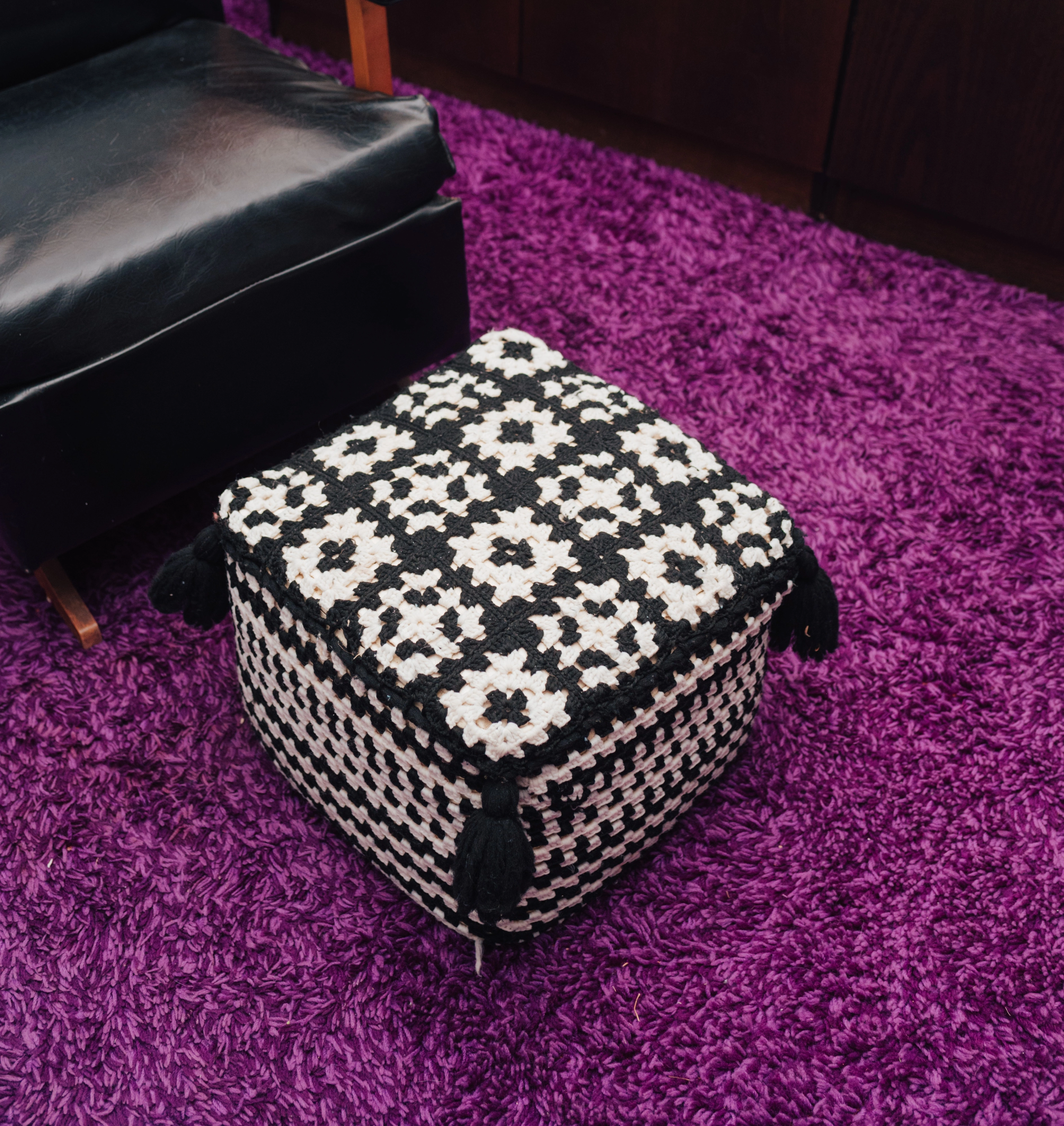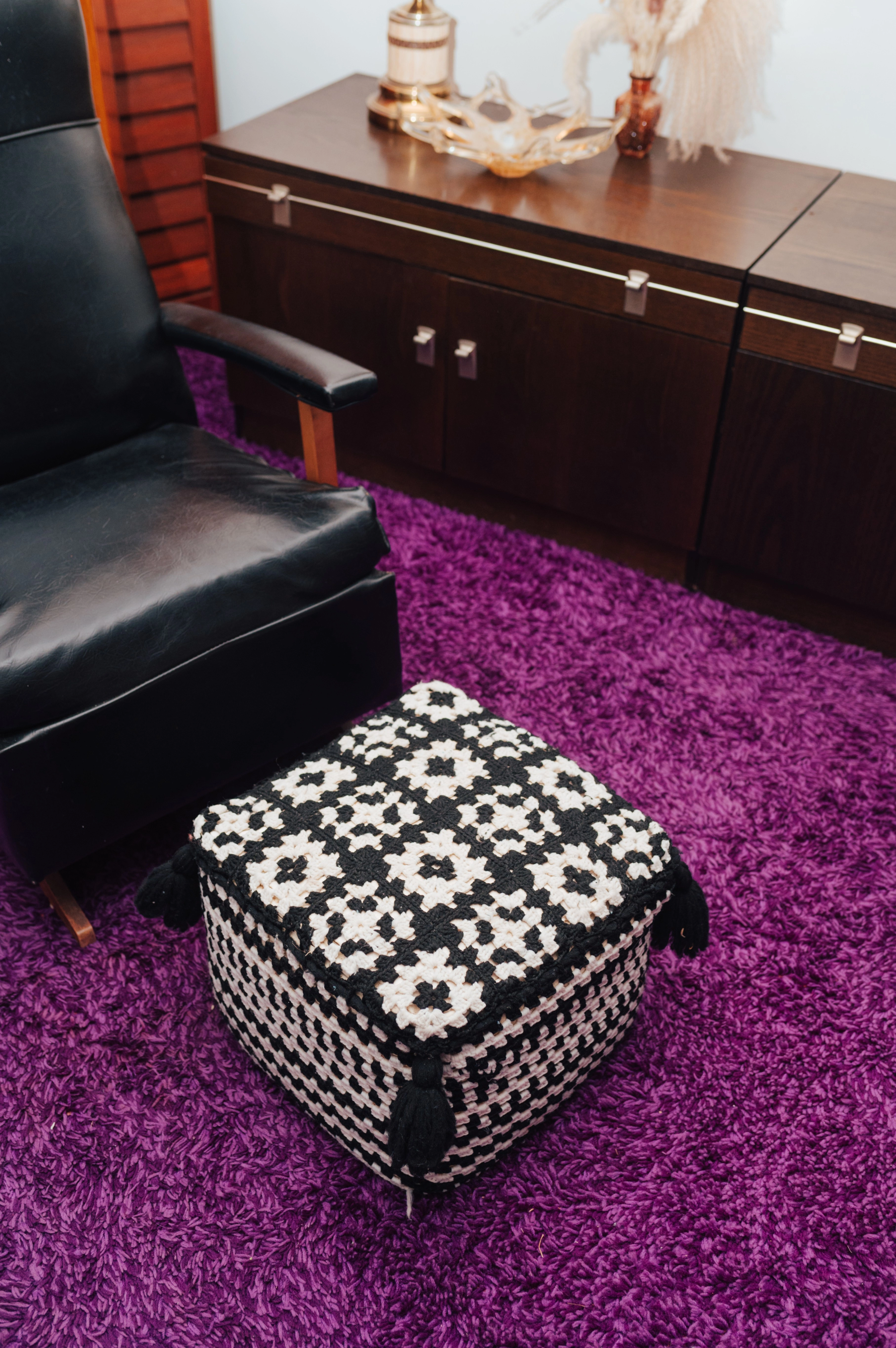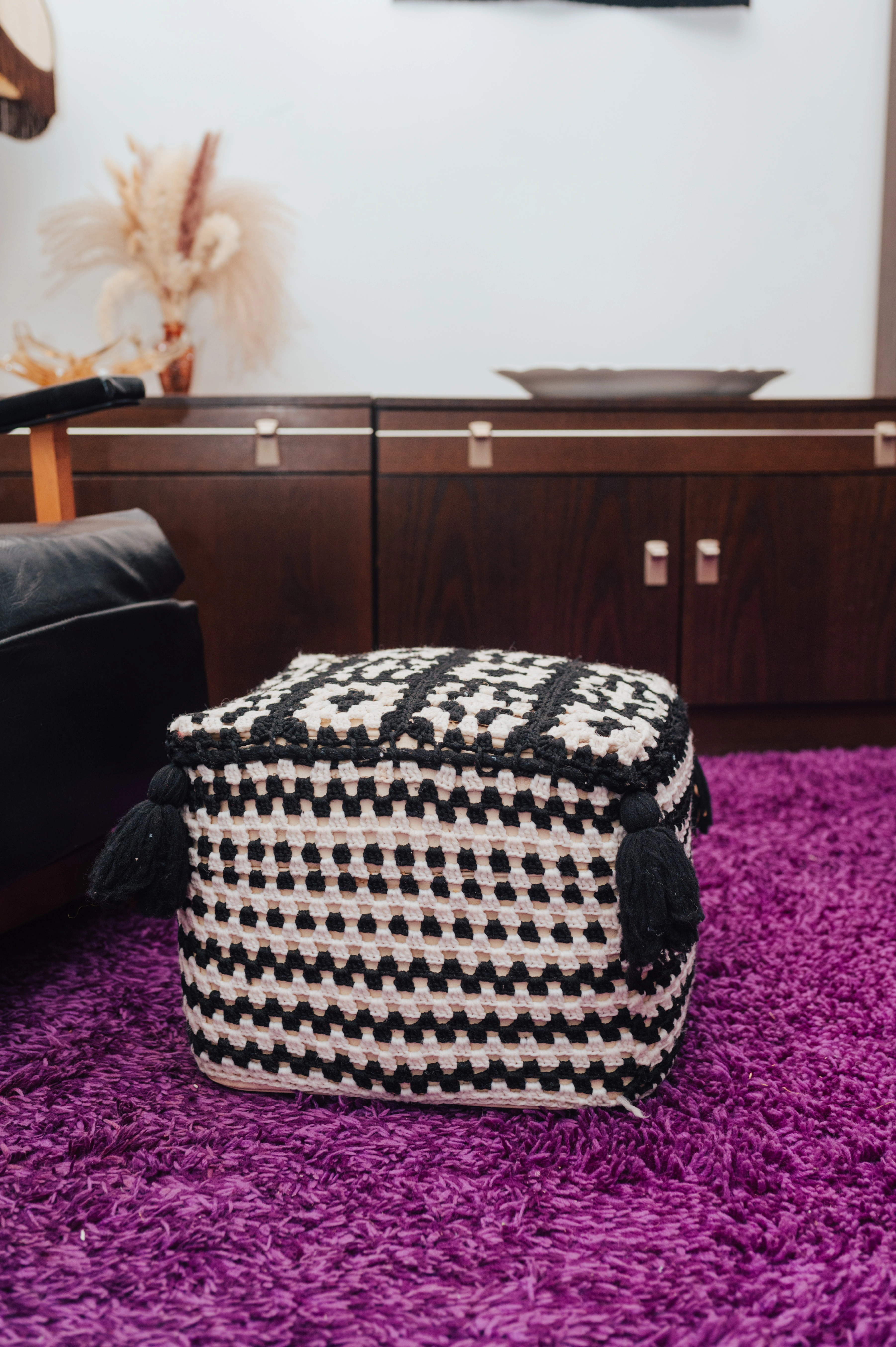 Beautiful handwoven ottoman in a classic black and white pattern.