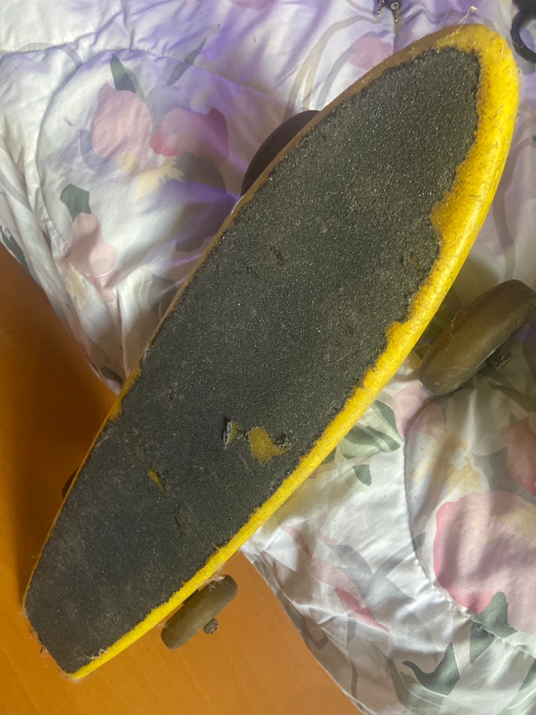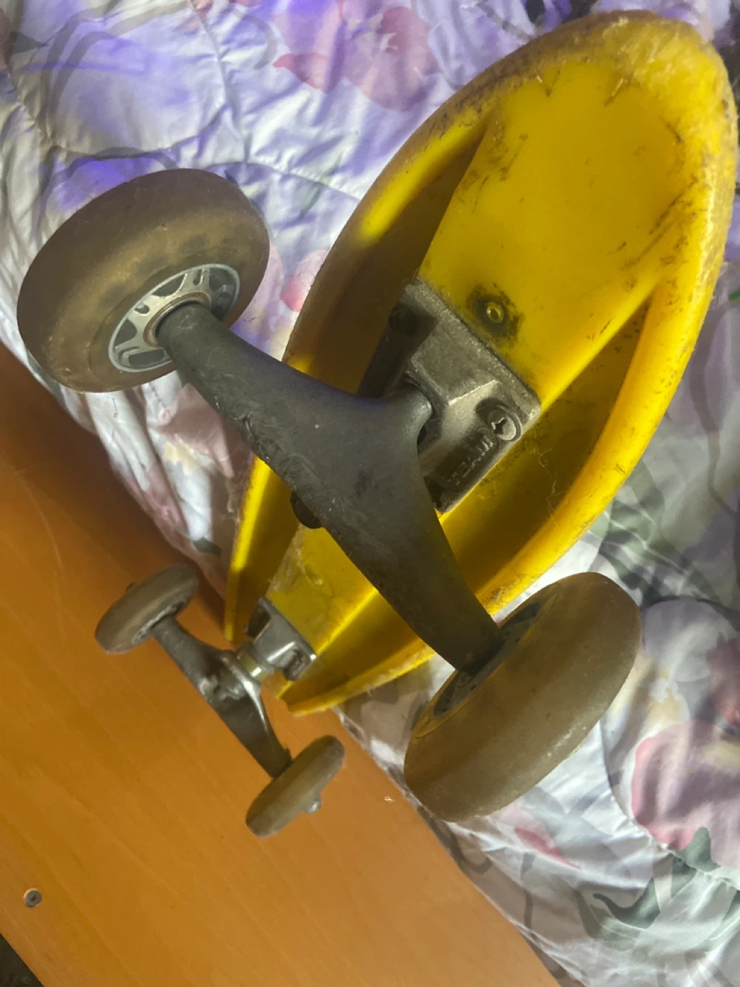 Selling a yellow banana board with roller blade wheels! It has some signs of use, but is still in good condition for cruising around the neighbourhood