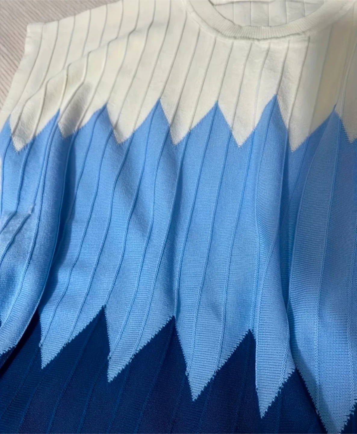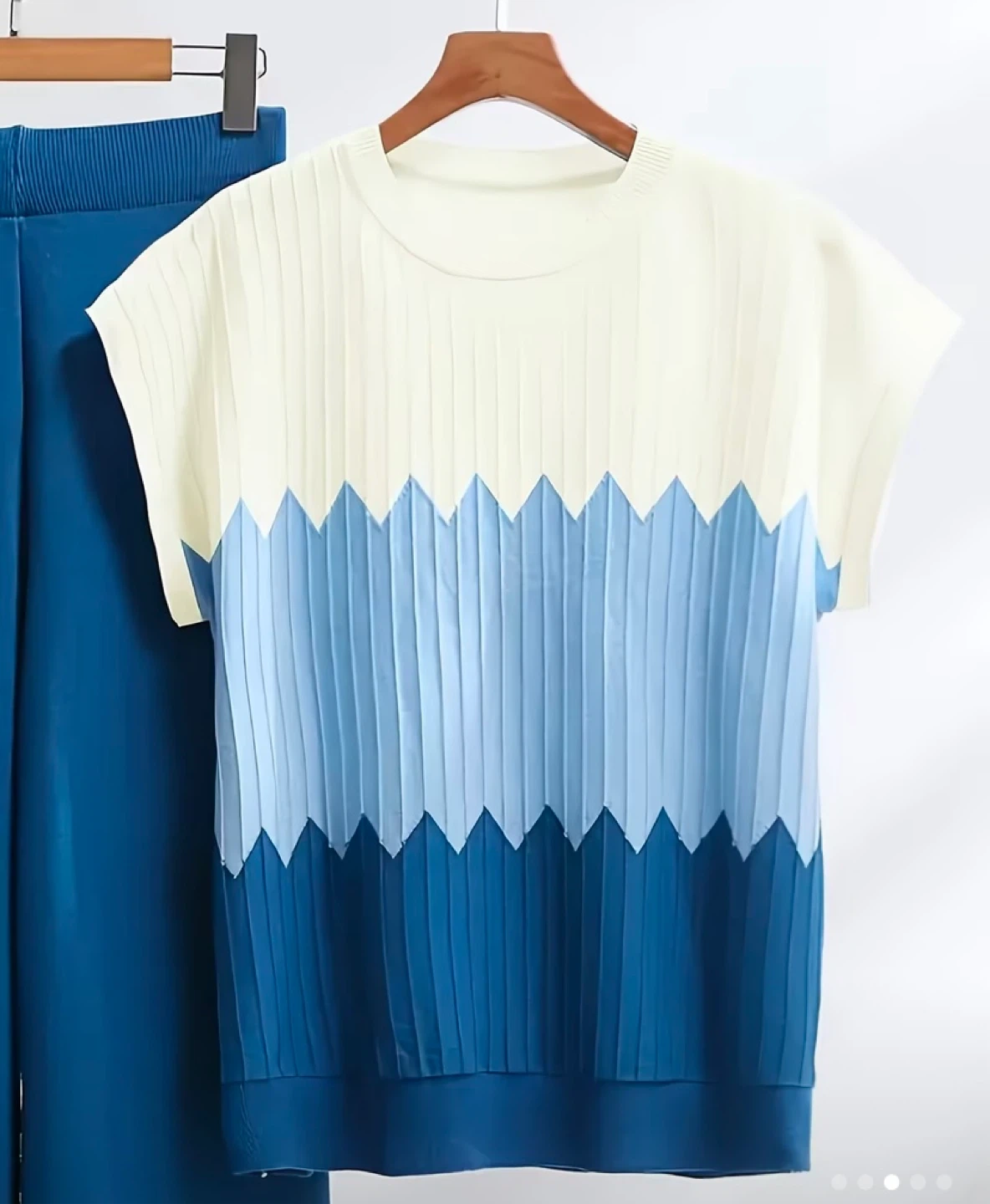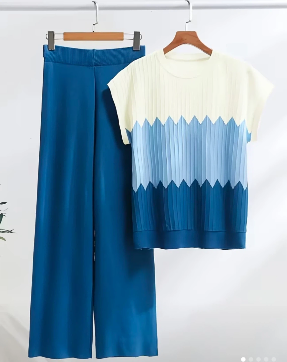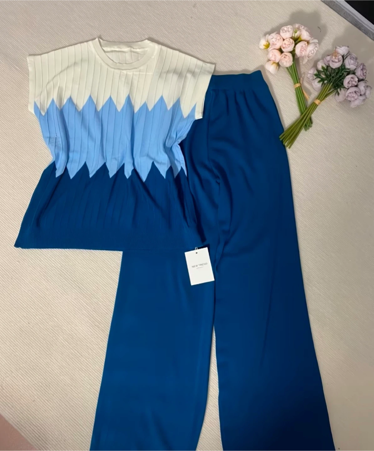 Cute two-piece set with a unique design! The top features a lovely color gradient from white to various shades of blue. It's a knit material that's both stylish and comfortable. The matching pants are a solid blue color and complete the set perfectly!