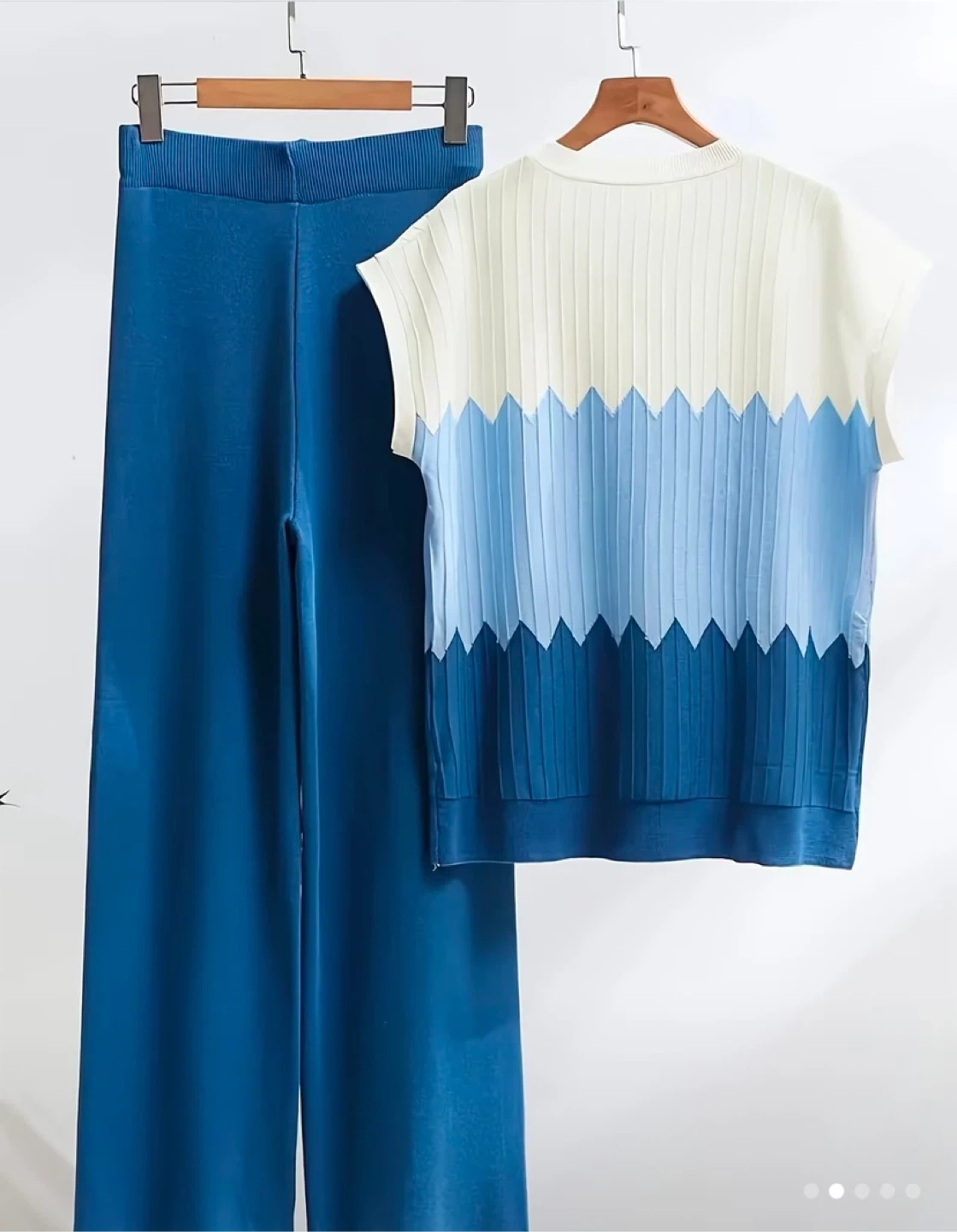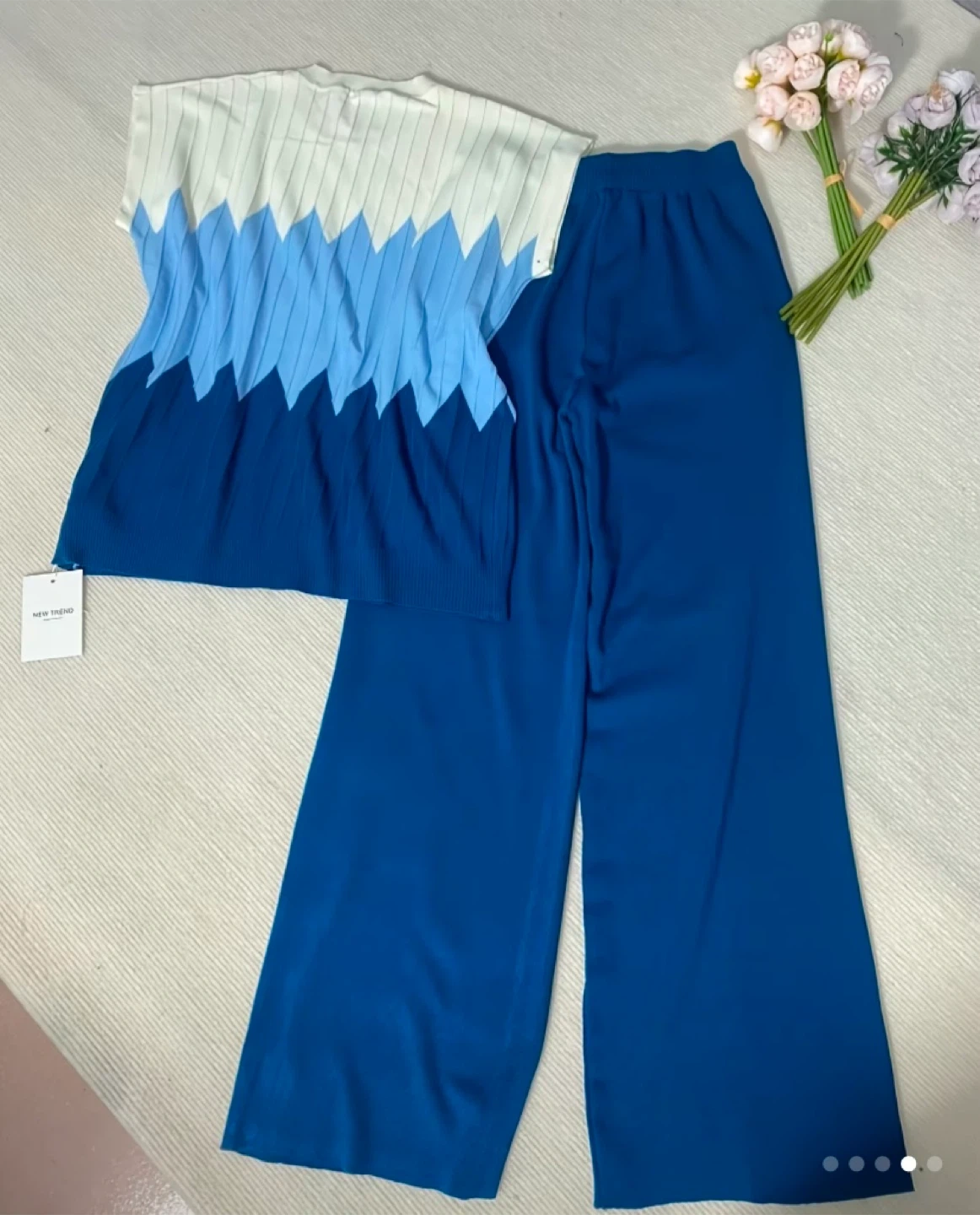 Cute two-piece set with a unique design! The top features a lovely color gradient from white to various shades of blue. It's a knit material that's both stylish and comfortable. The matching pants are a solid blue color and complete the set perfectly!
