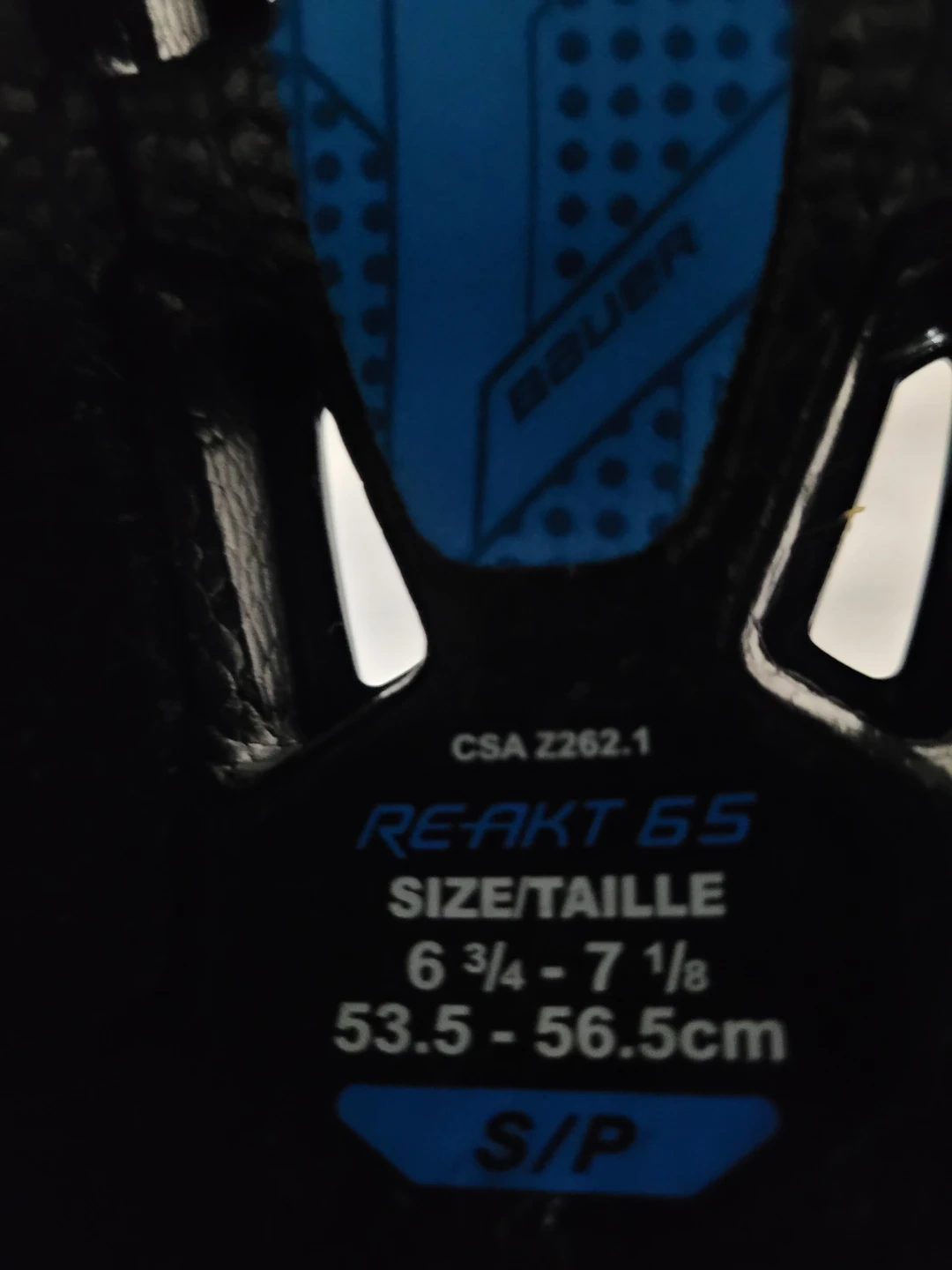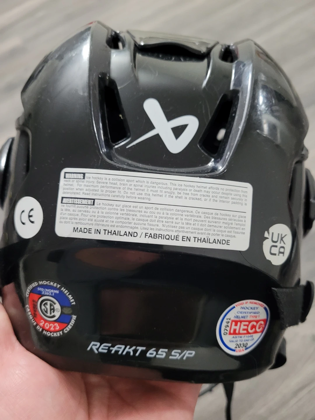 Selling a Bauer Re-Akt 65 hockey helmet. It's black and in great shape! The size is S/P, which fits head sizes 6 3/4 - 7 1/8 (53.5 - 56.5cm). Perfect for anyone looking for reliable head protection on the ice