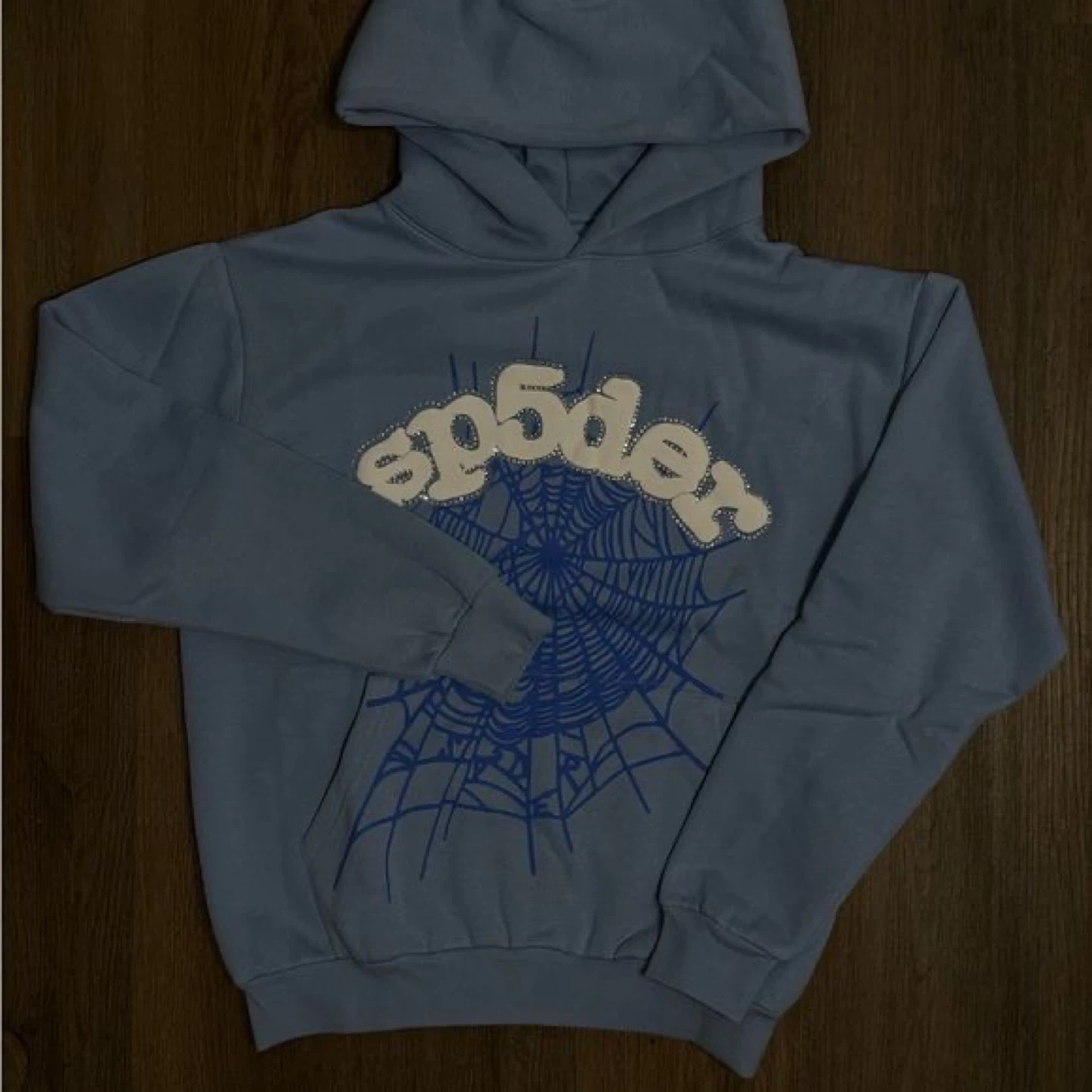Selling a Sp5der hoodie in a nice blue colour! It features the brand's name in a unique font with a spiderweb design. Perfect for adding a stylish touch to your wardrobe