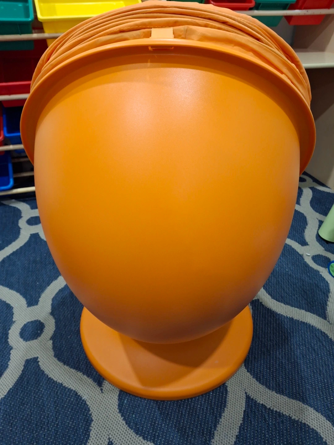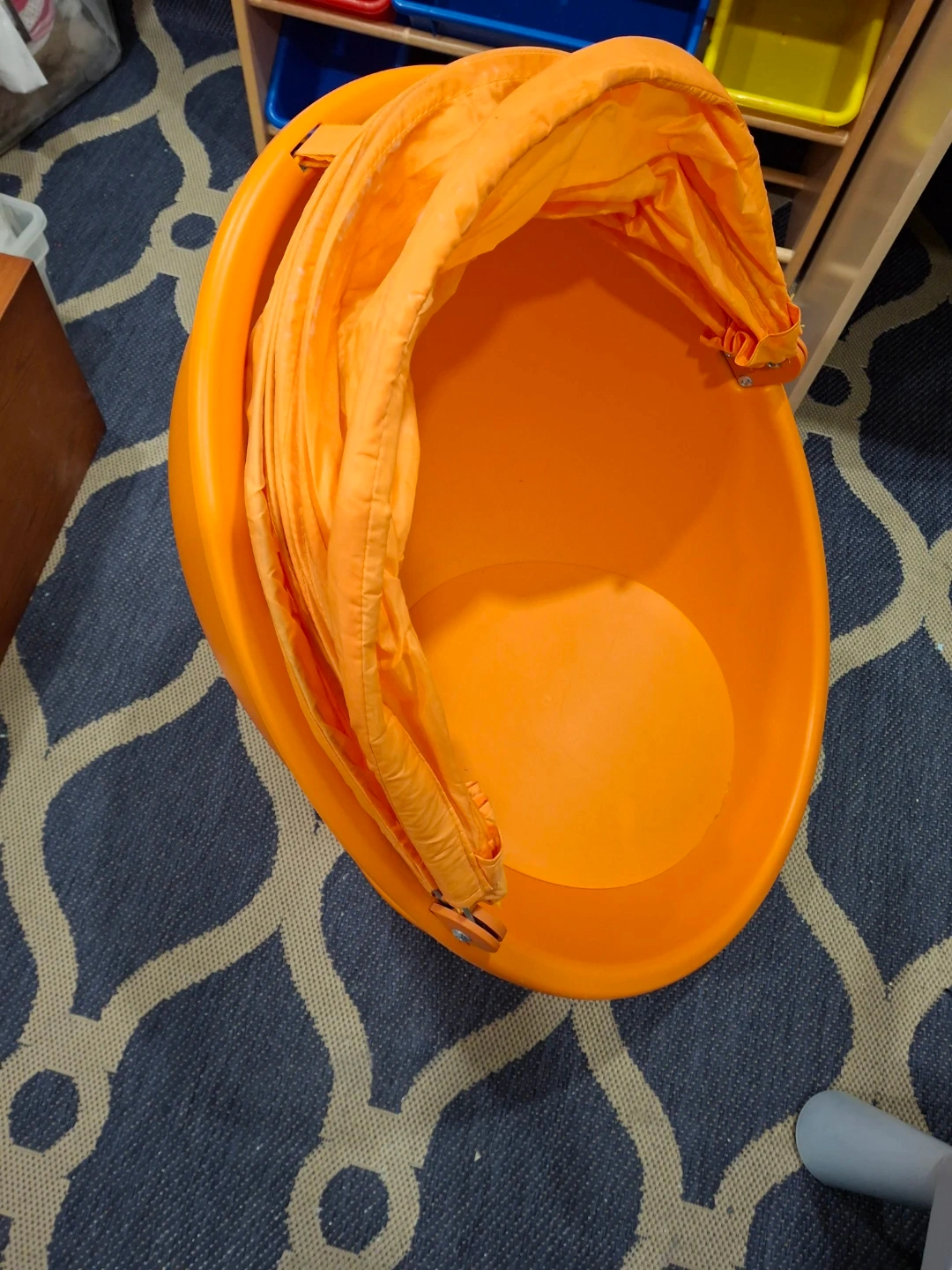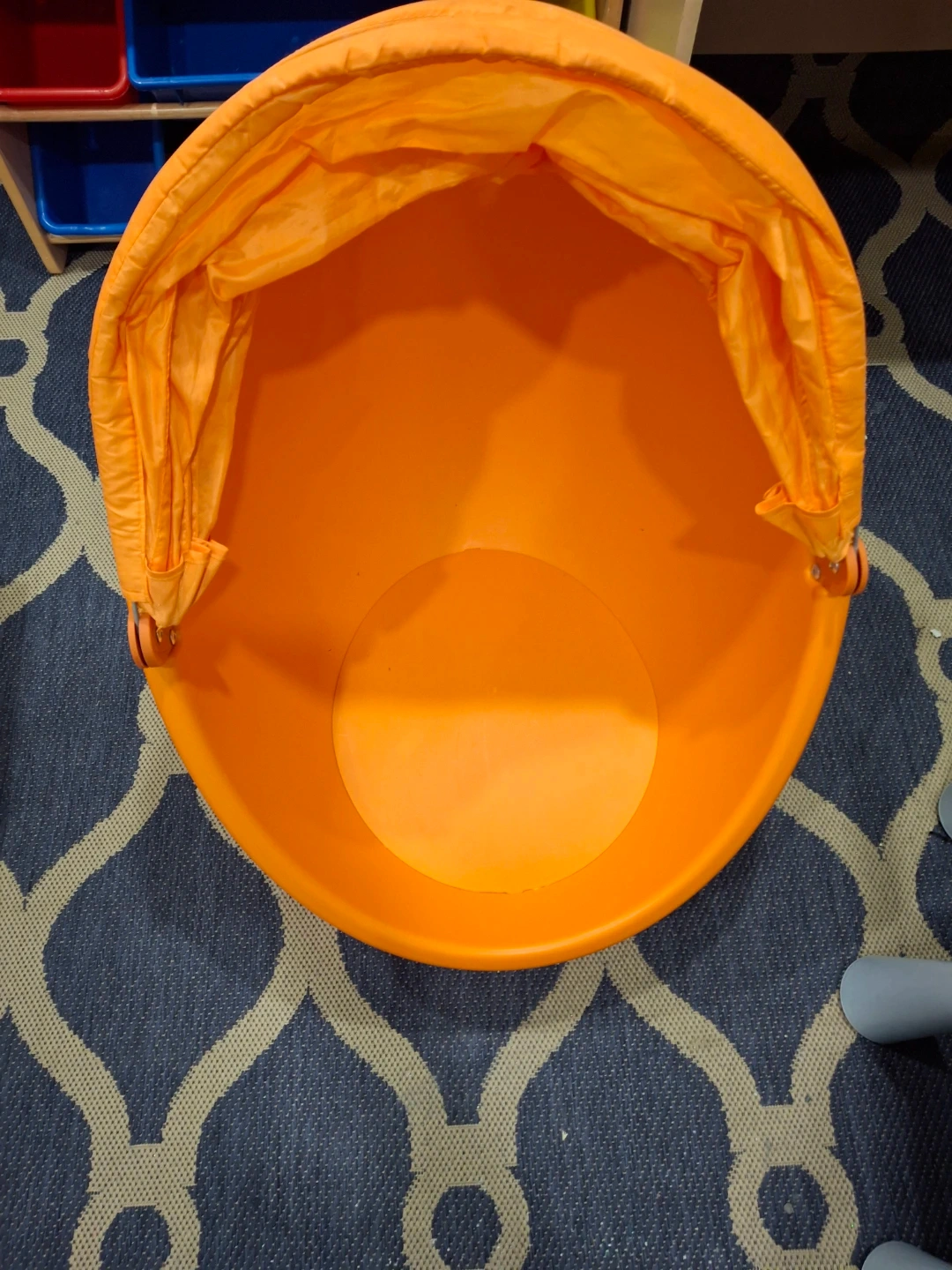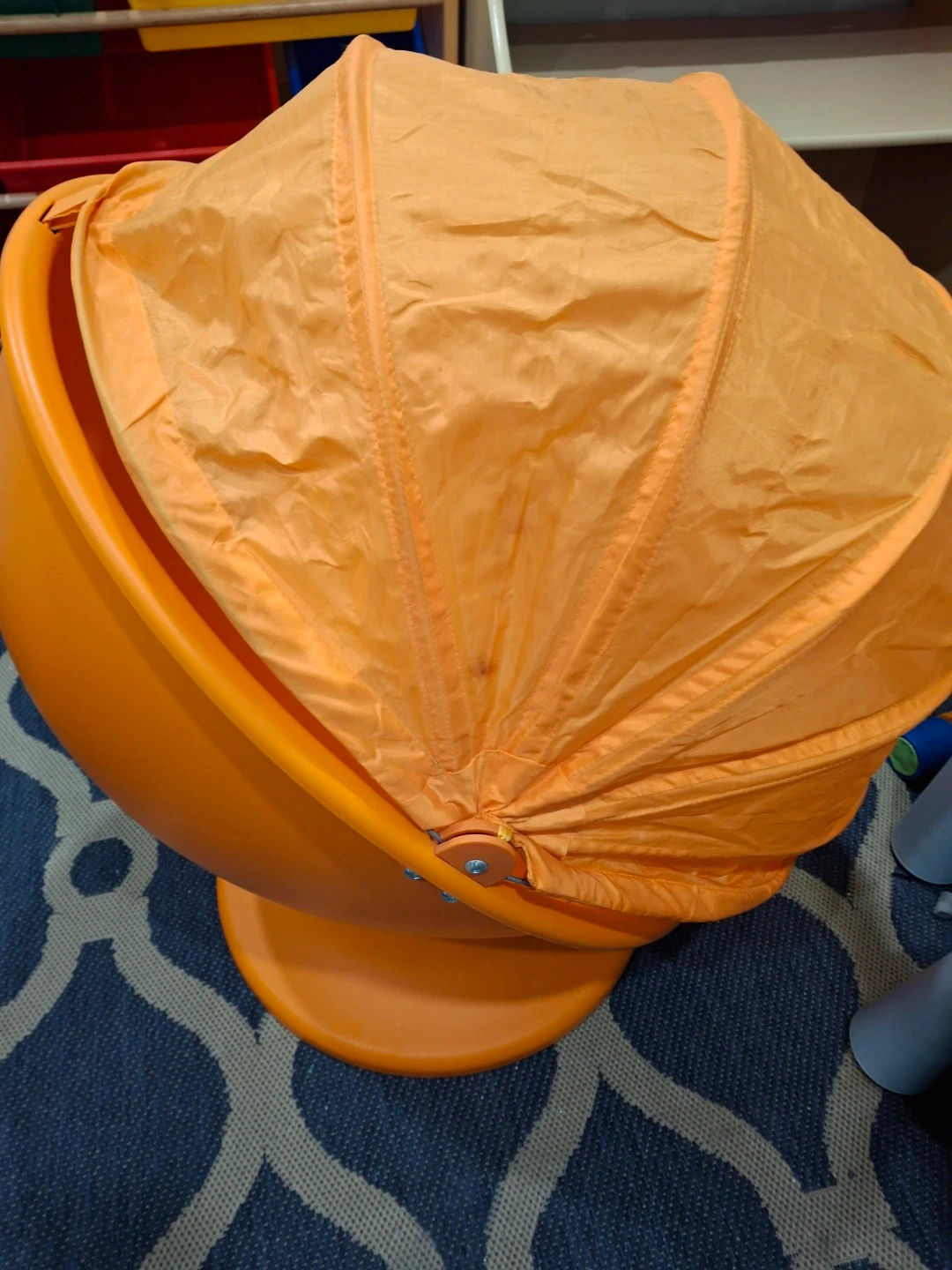 Selling a fun orange pod chair for kids! It's in great shape and would be a cozy little nook for reading or relaxing. The chair has a unique design with a retractable hood.