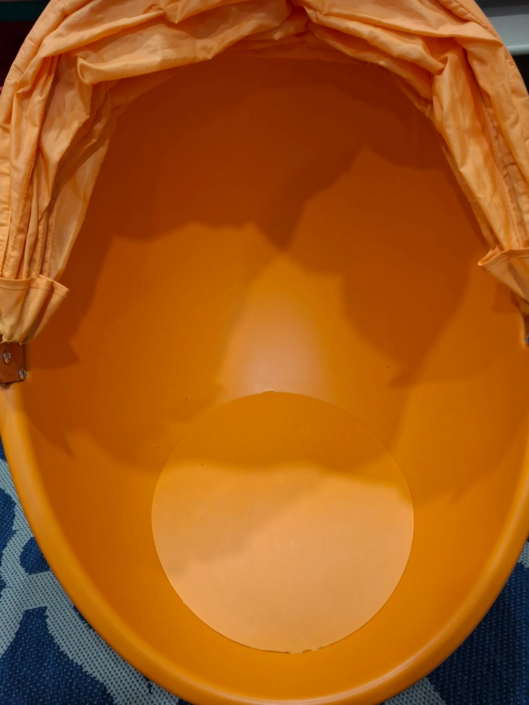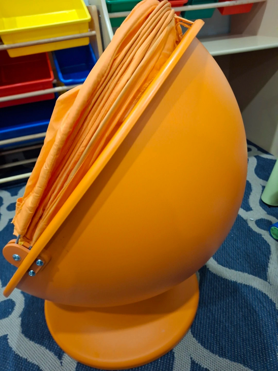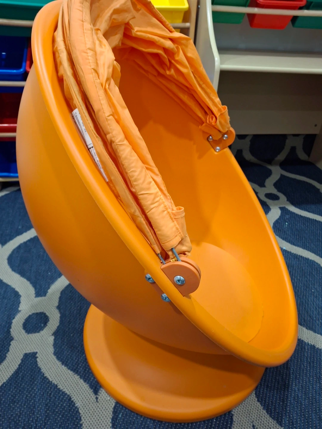 Selling a fun orange pod chair for kids! It's in great shape and would be a cozy little nook for reading or relaxing. The chair has a unique design with a retractable hood.