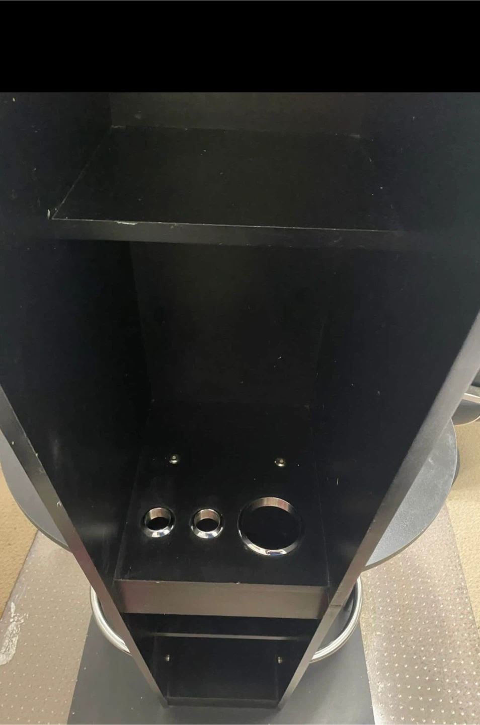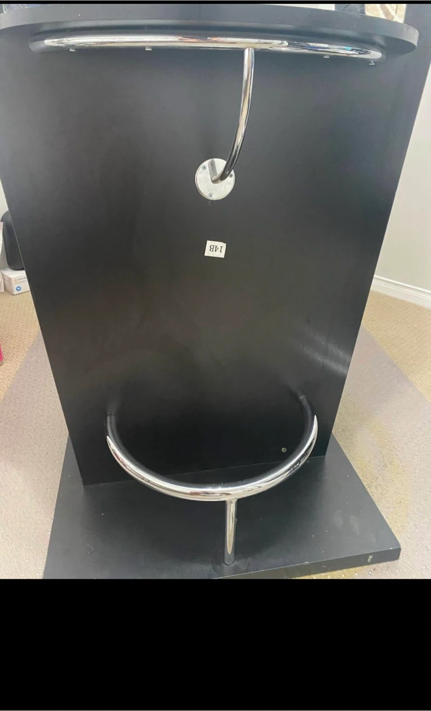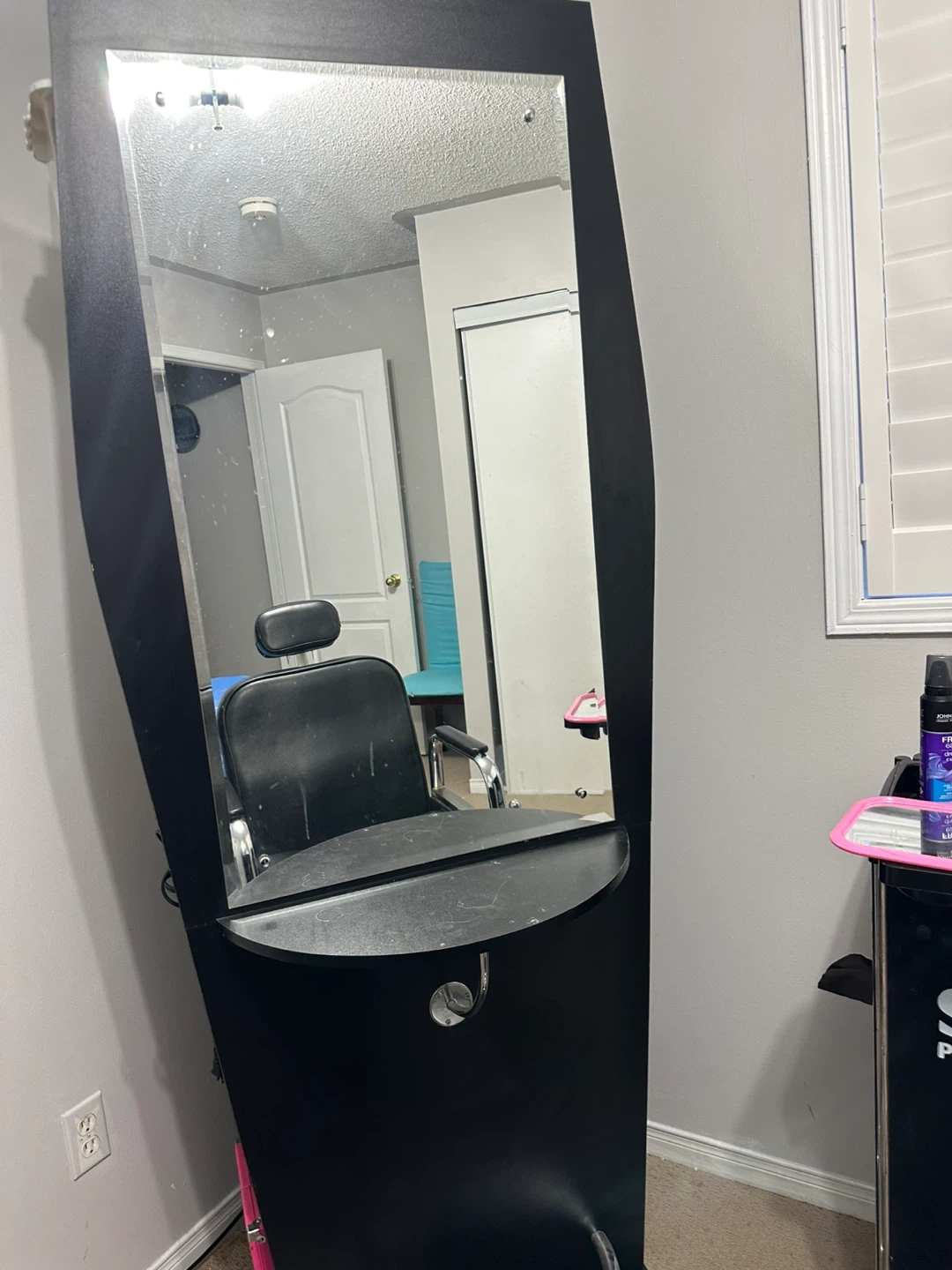 Selling a black salon styling station with a mirror. It features a built-in mirror, a shelf, and holders for styling tools. Perfect for setting up your own salon space at home!