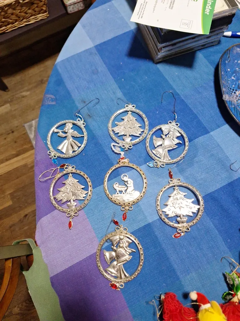 A set of cute Christmas ornaments featuring an angel, Christmas tree, and nativity scene! They're perfect for adding a festive touch to your holiday decor